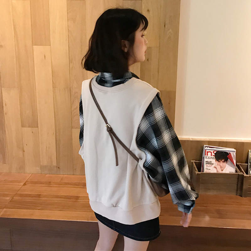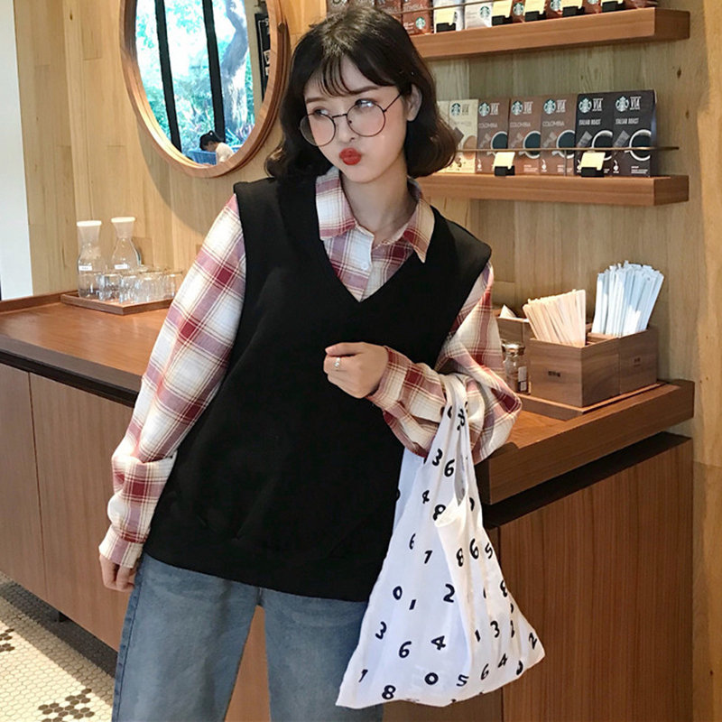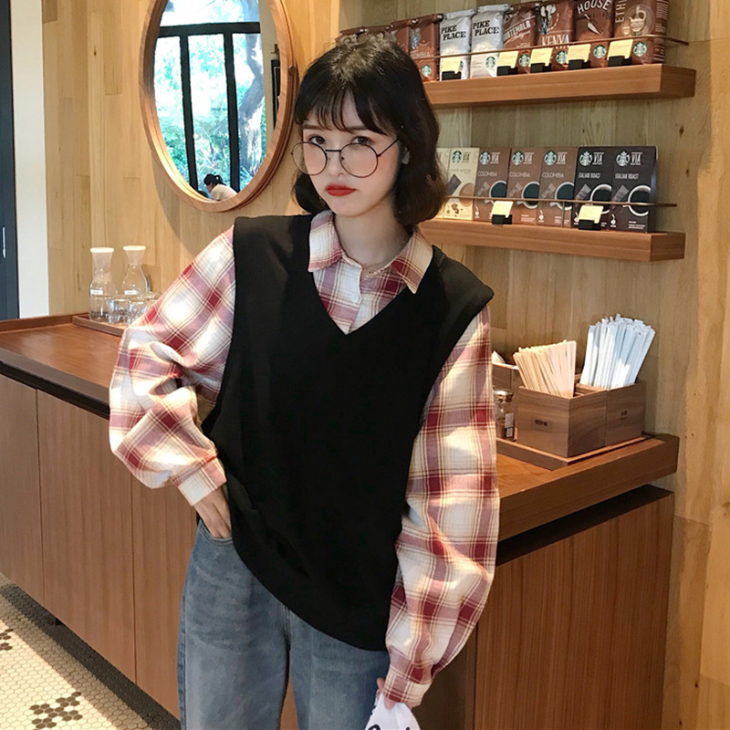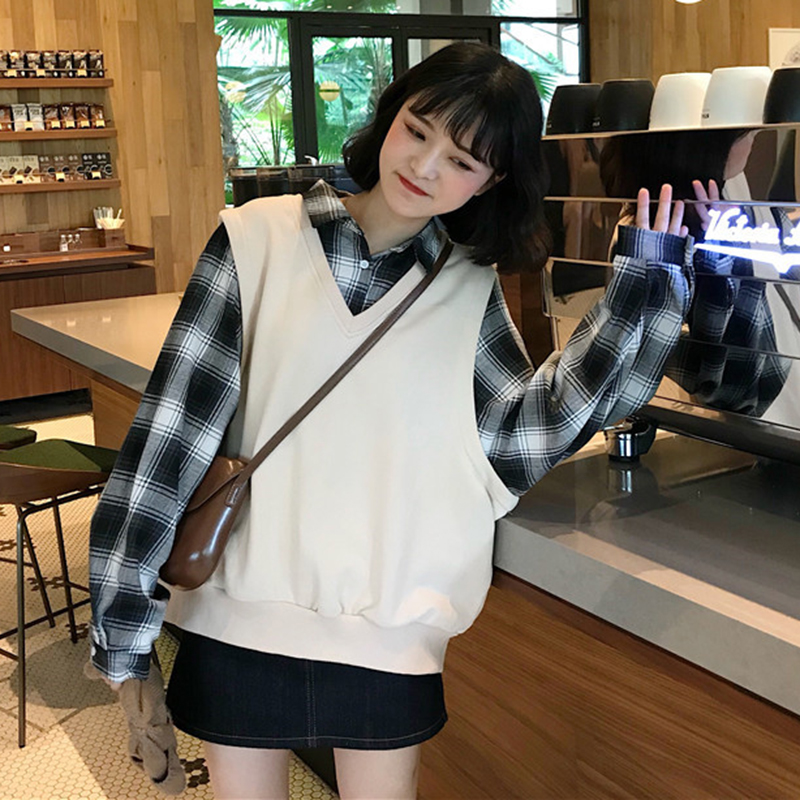 / 假兩件長袖襯衫女秋裝新款復古寬松格子拼接衛衣背心學生港味上衣