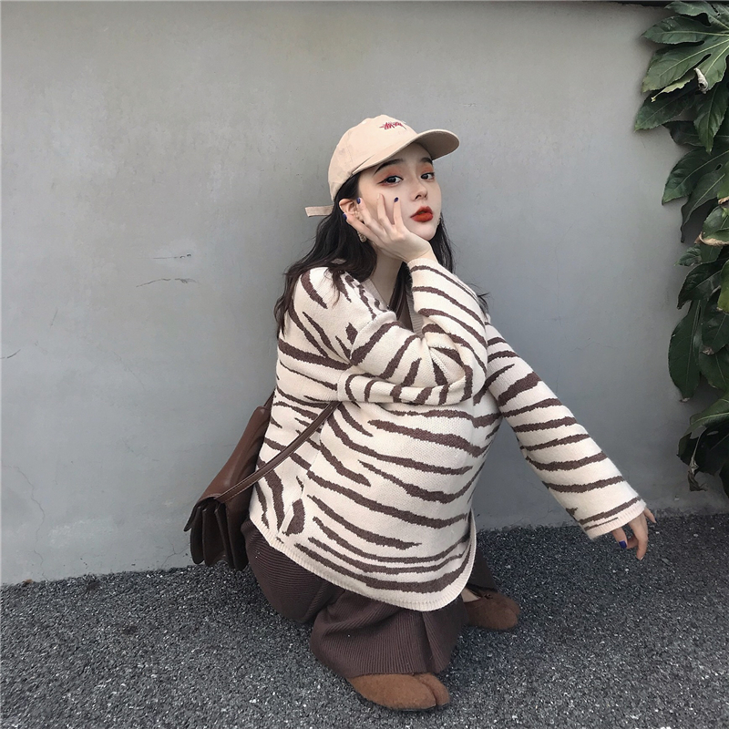 / chic慵懶風網紅毛衣女2018新款寬松百搭虎紋氣質套頭V領針織衫潮