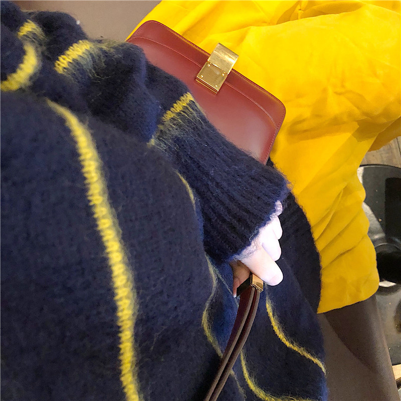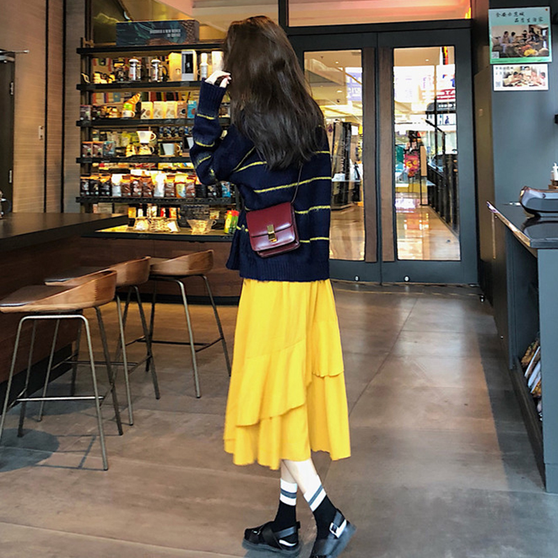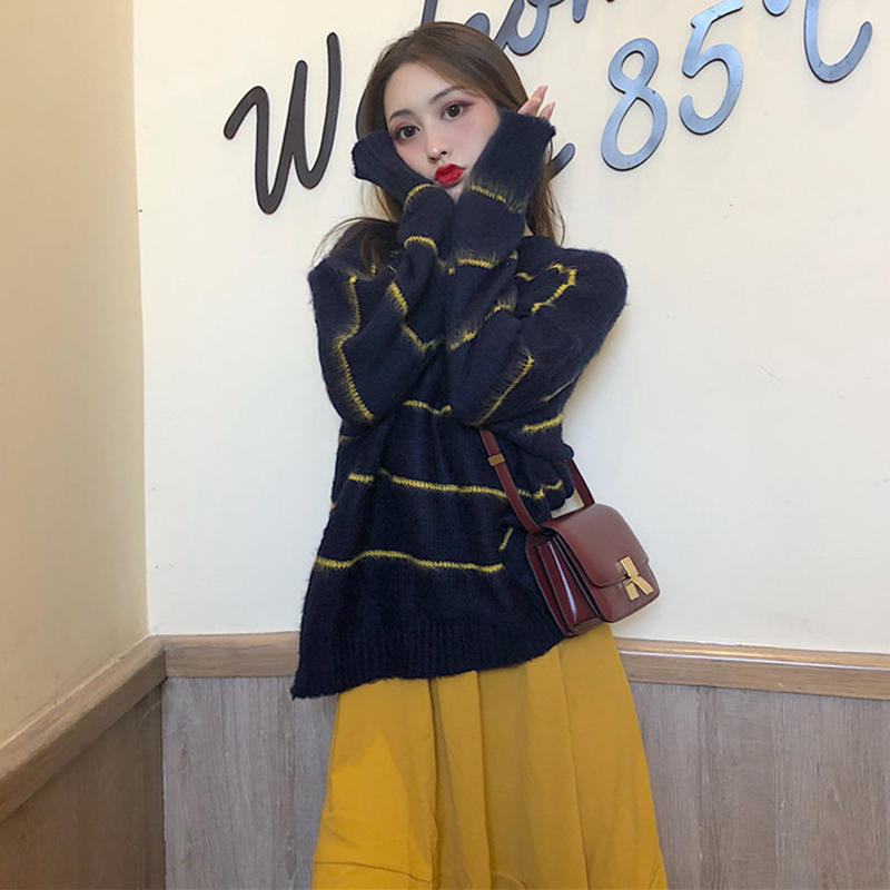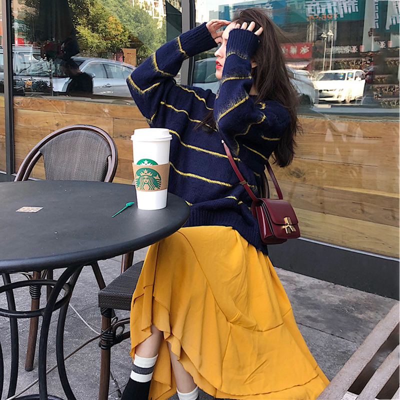 / 御姐套裝女秋冬新款慵懶寬松條紋毛衣外套高腰A字半身裙蛋糕裙子