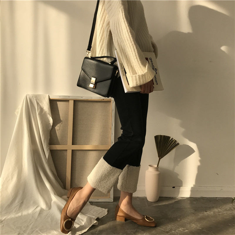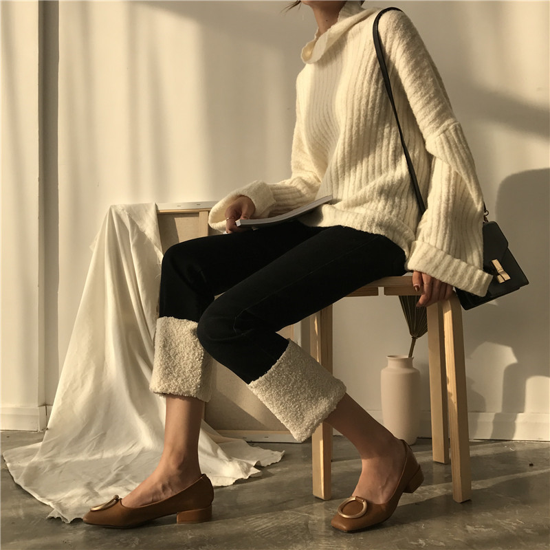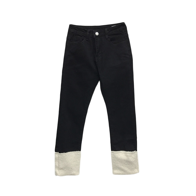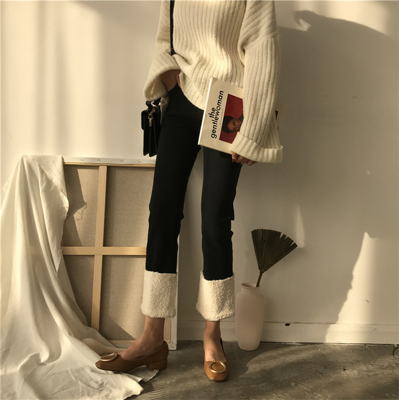 / 秋冬2018新款韓版高腰修身顯瘦直筒褲羊羔毛拼接加厚彈力牛仔褲女