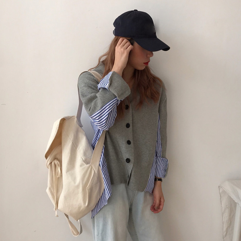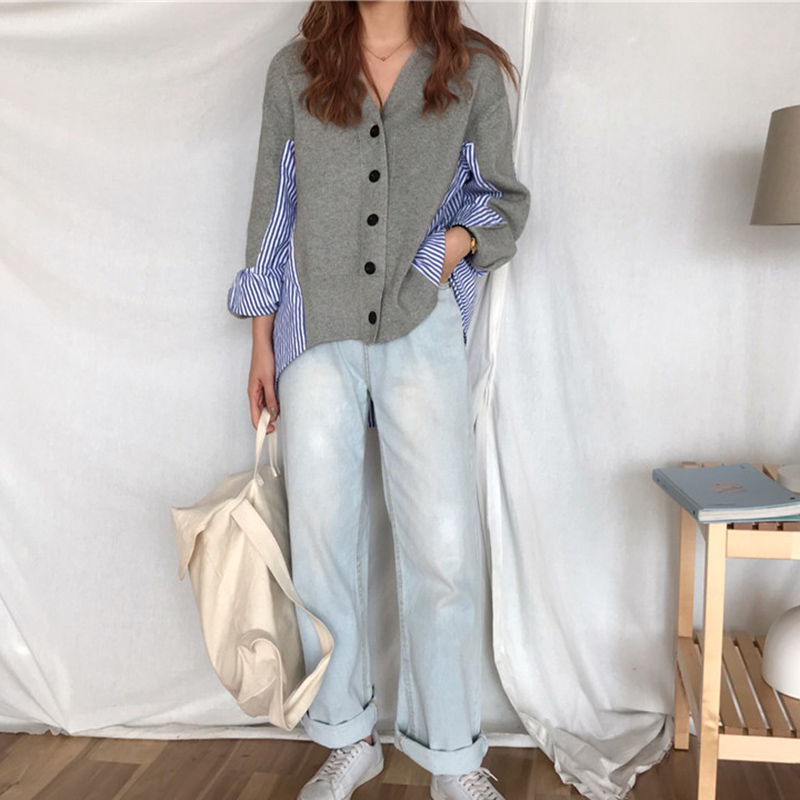 / 不規則條紋拼接針織毛衣秋裝女2018新款學生寬松V領韓版長袖上衣