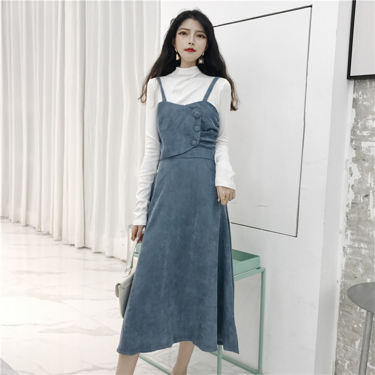 韓版修身復古中長款收腰燈芯絨吊帶連衣裙+黑色百搭高領打底衫潮