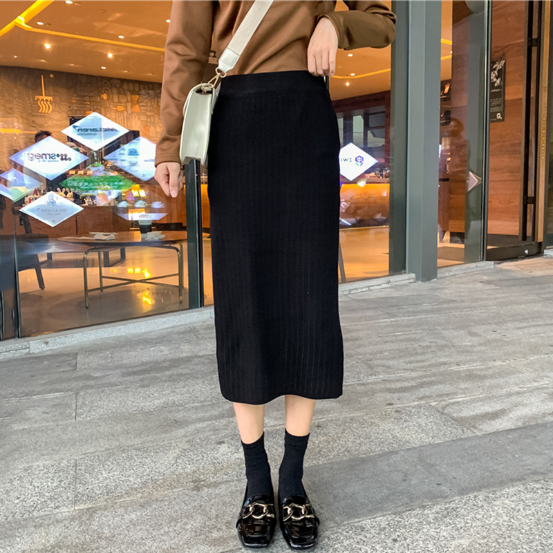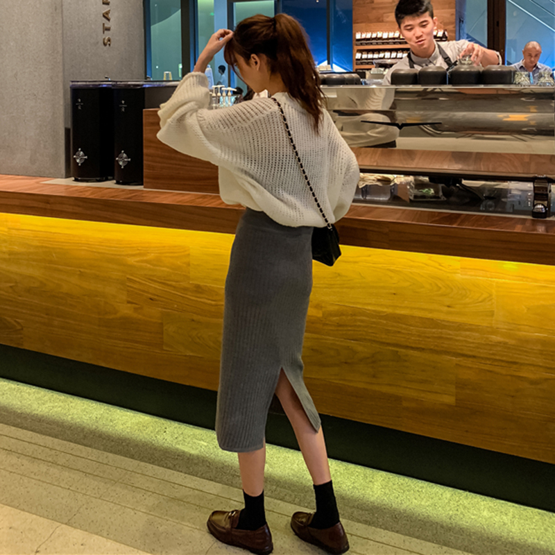 / 中長款開叉一步裙女冬裝2018新款韓版高腰顯瘦A字裙針織半身裙子