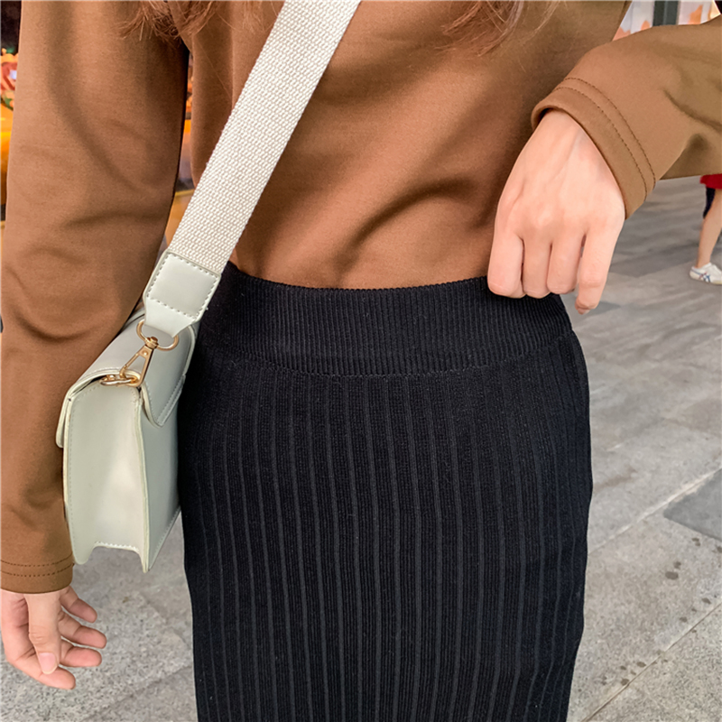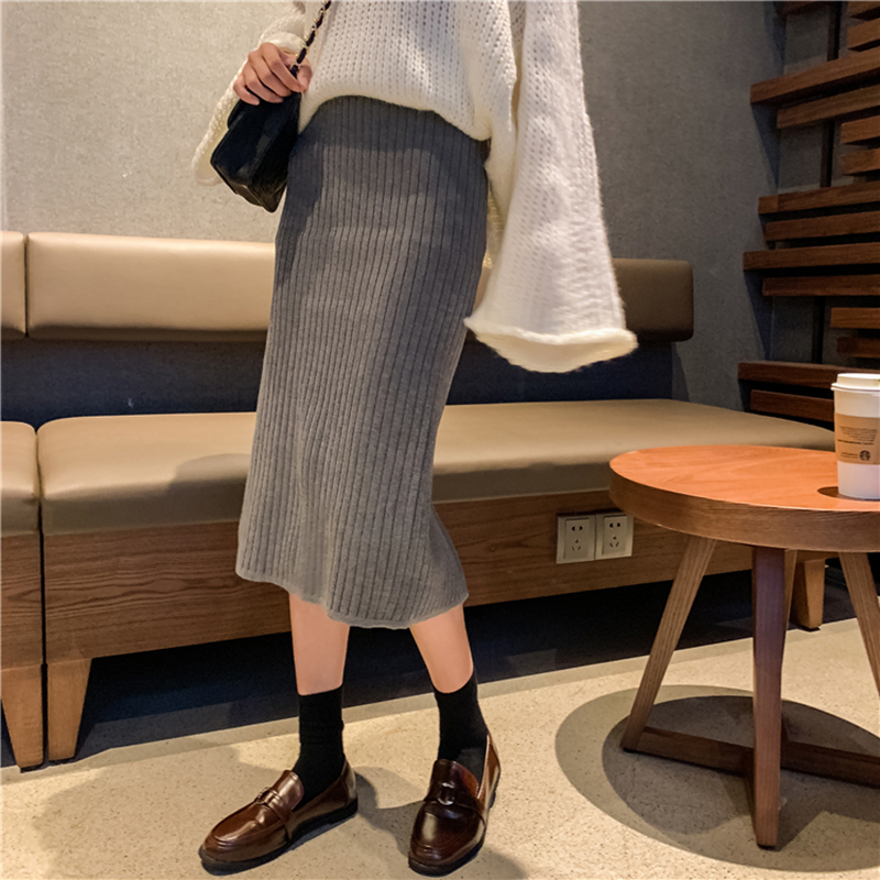 中長款開叉一步裙女冬裝2018新款韓版高腰顯瘦A字裙針織半身裙子