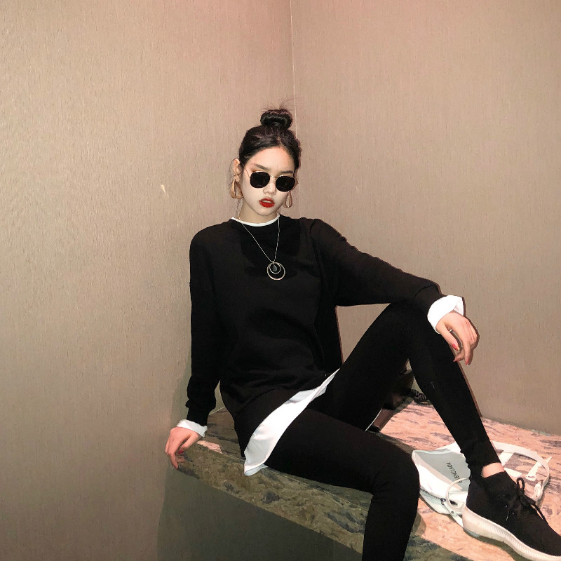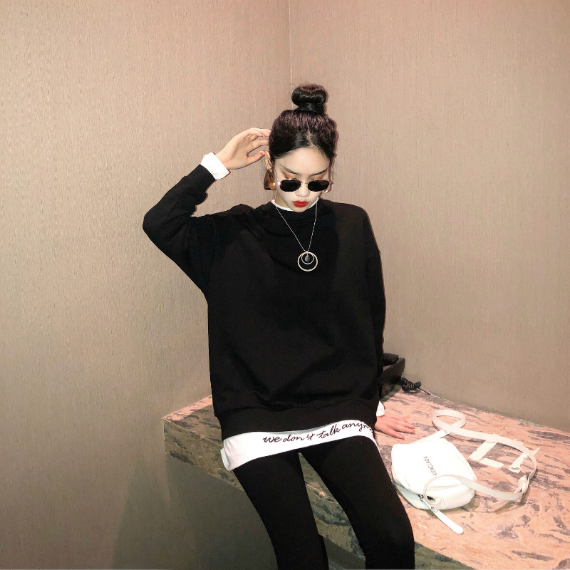 / 韓國復古風寬松顯瘦字母印花假兩件衛衣女+百搭修身打底褲兩件套