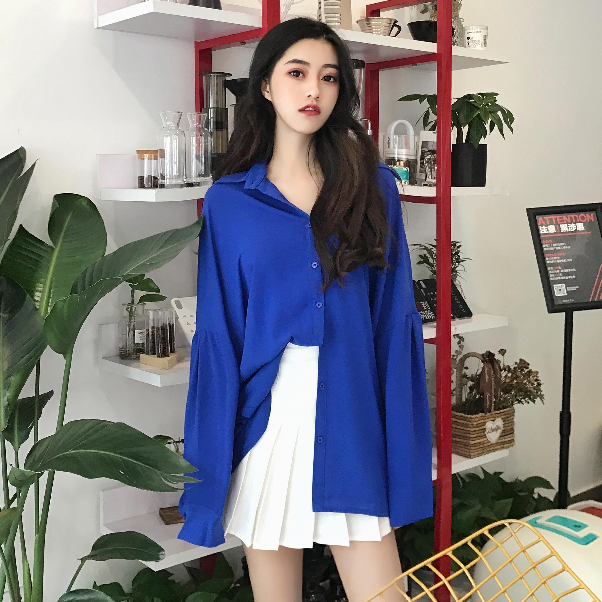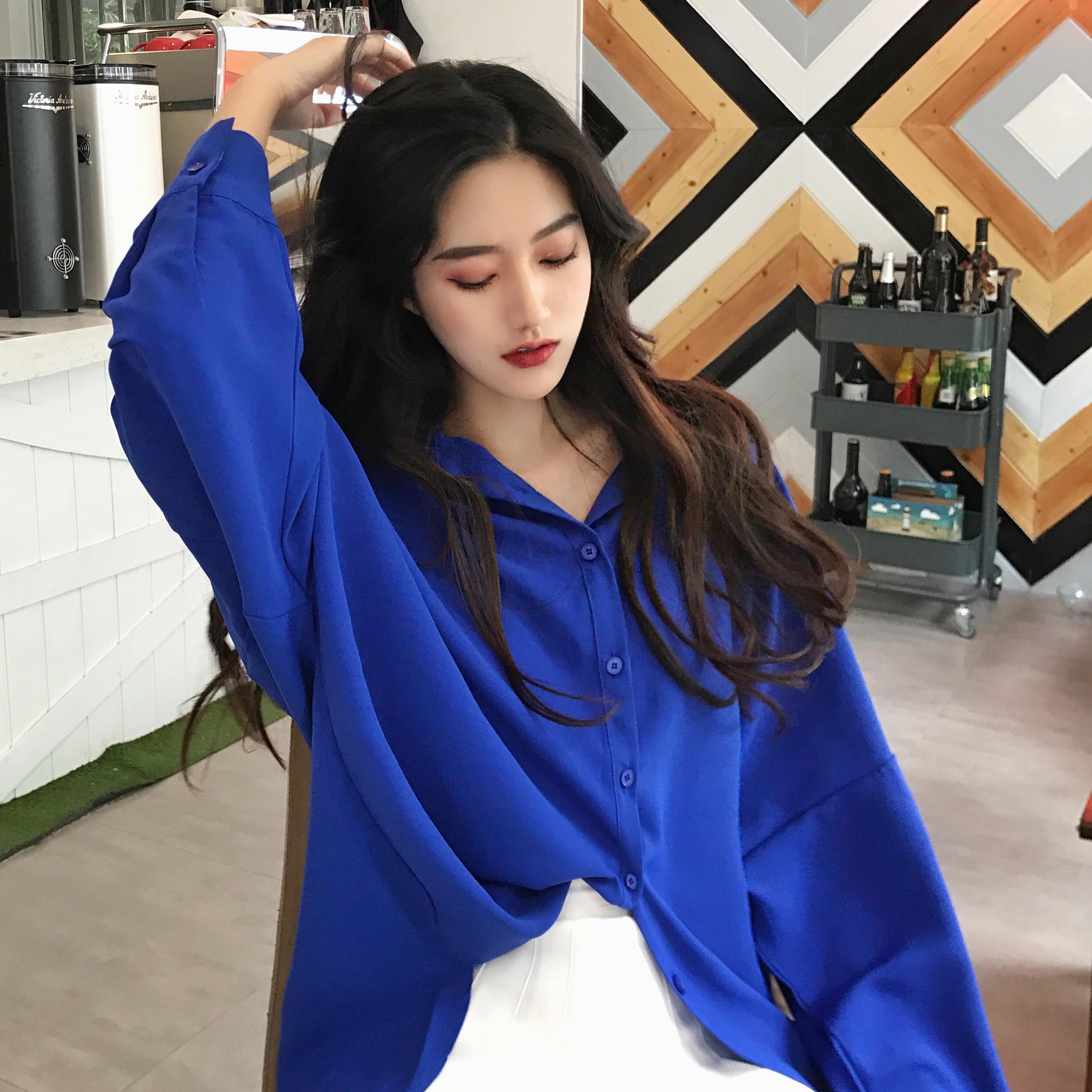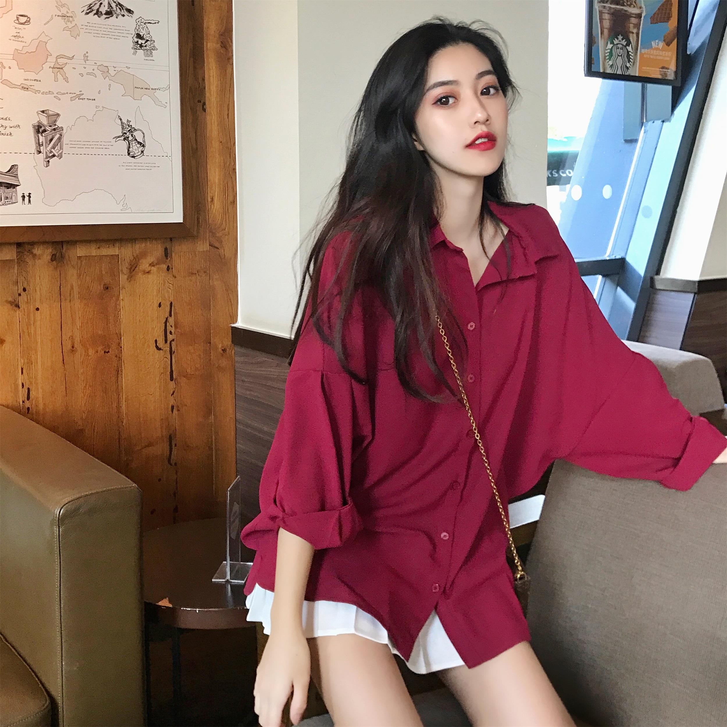 / 韓版復古chic新款百搭蝙蝠袖寬松翻領排扣長袖純色中長款襯衫女潮