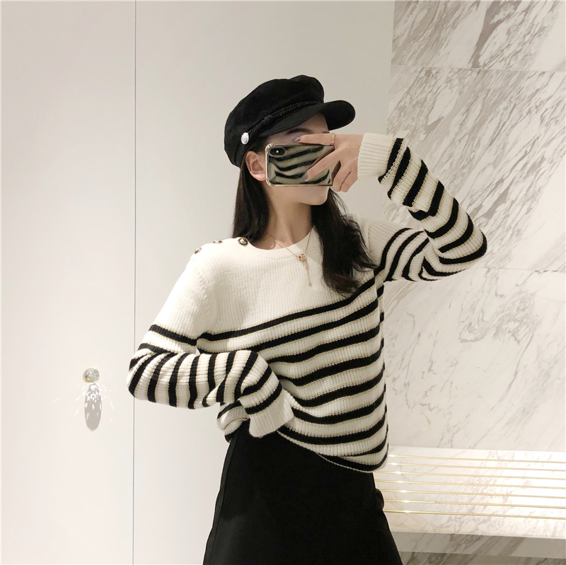 / 慵懶風套頭毛衣女2018新款秋冬金屬扣中長款條紋毛衣女針織衫上衣