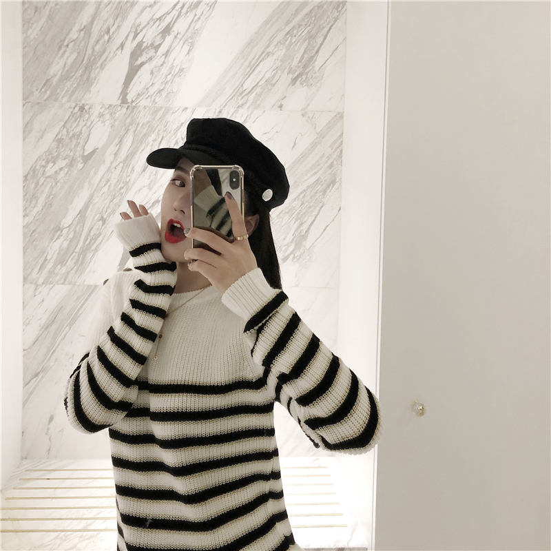 韓版百搭慵懶風毛衣女2018新款寬松oversize條紋中長款毛線上衣潮
