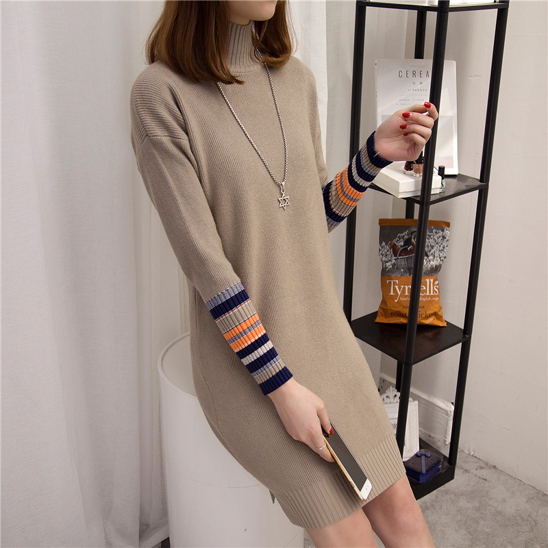 冬季女裝韓版新款潮半高領針織衫套頭寬松中長款開叉毛衣裙