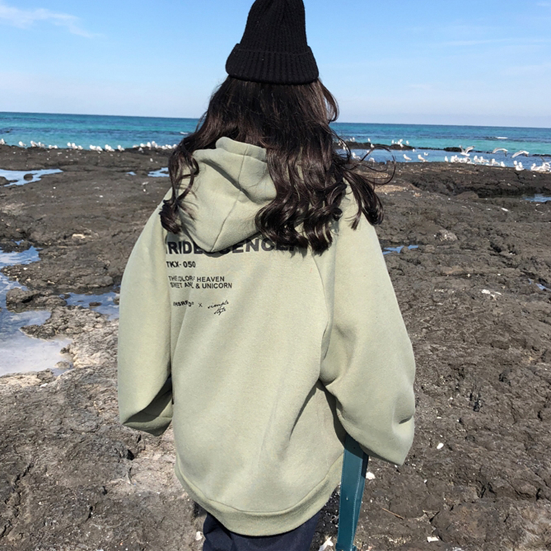 / 秋冬女裝韓版中長款復古寬松連帽慵懶風字母加絨加厚衛衣上衣外套