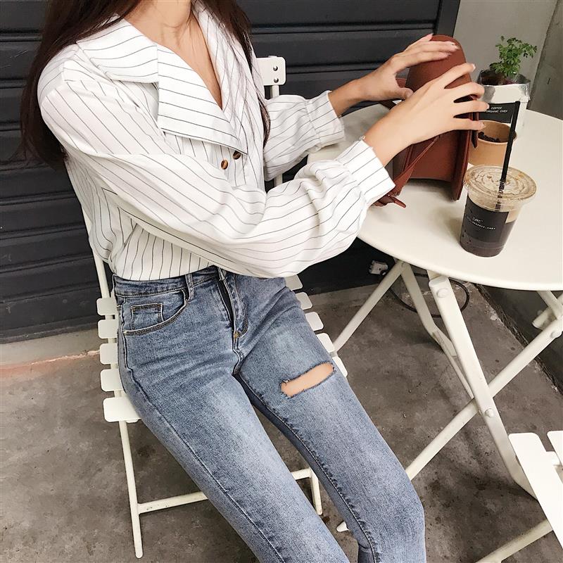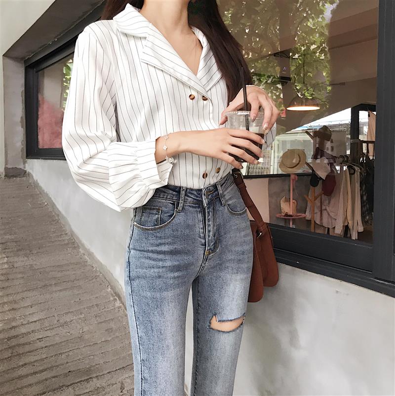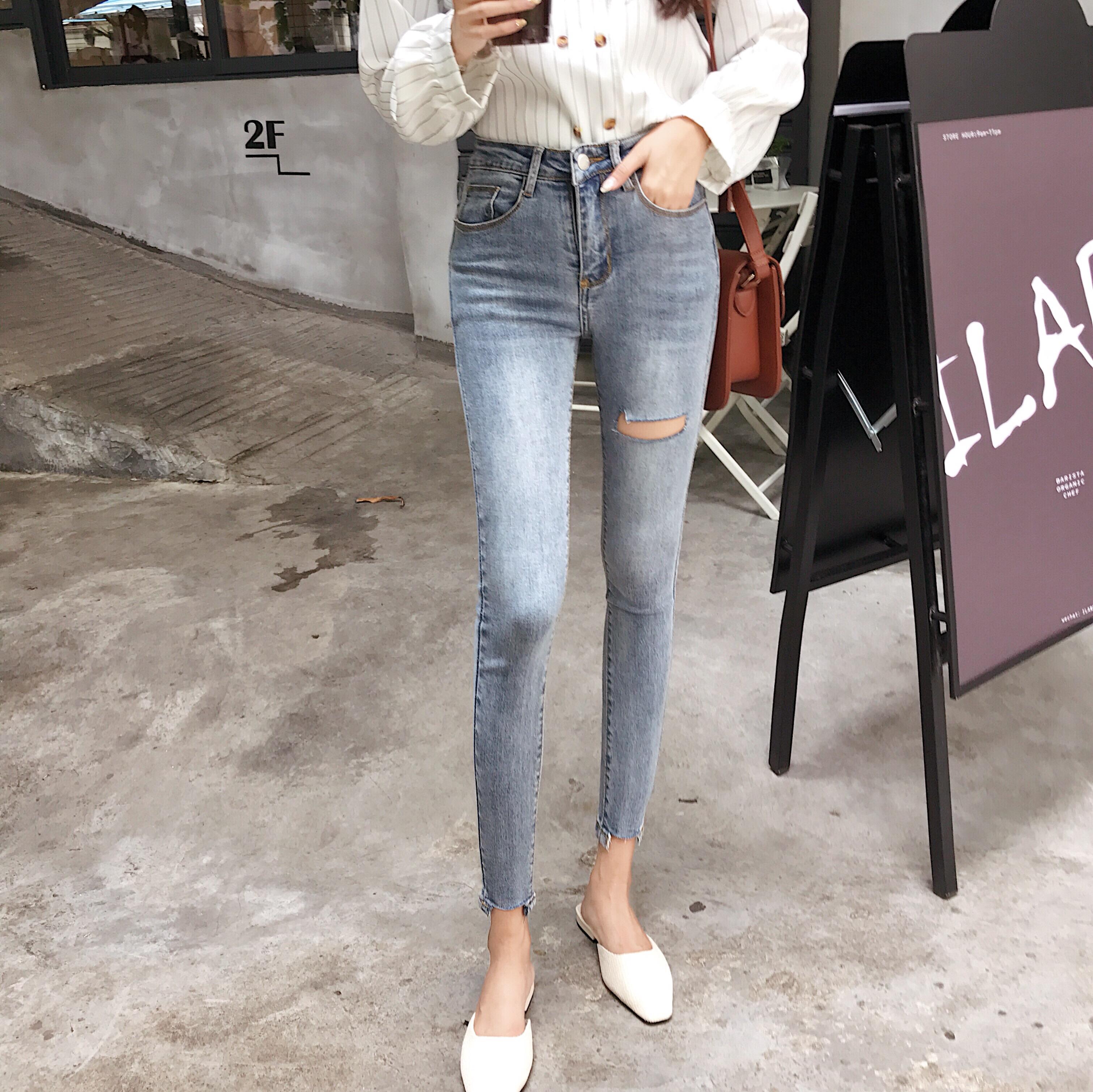 新款chic秋季破洞剪邊九分牛仔褲女韓版修身顯瘦高腰小腳鉛筆褲潮