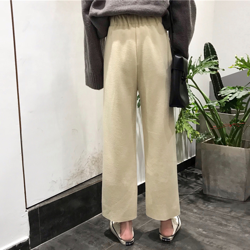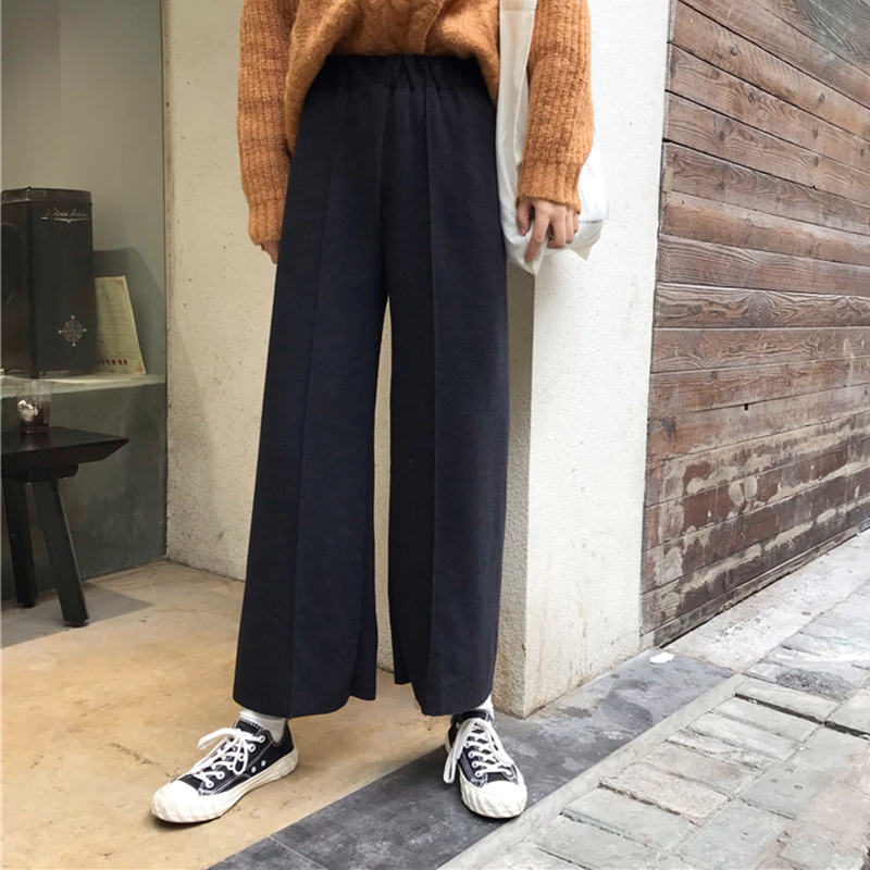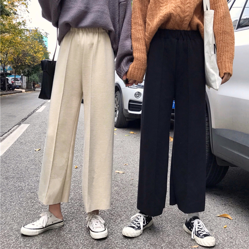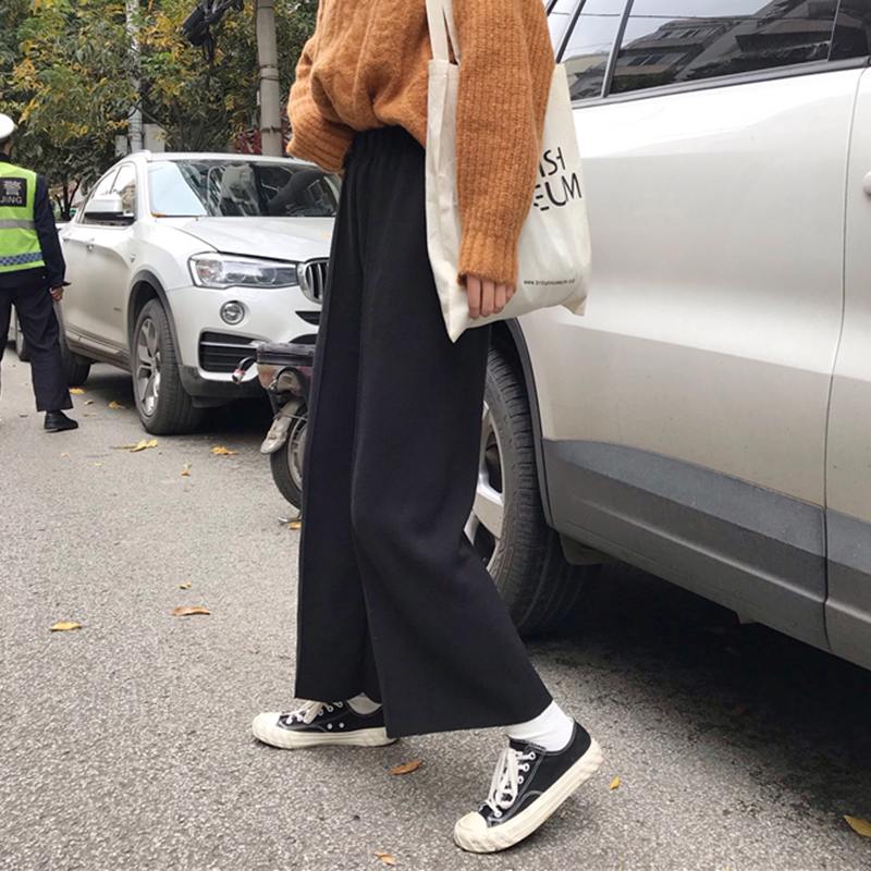 / 時尚高腰顯瘦針織休閑褲子女秋冬裝新款學生黑色墜感寬松闊腿長褲