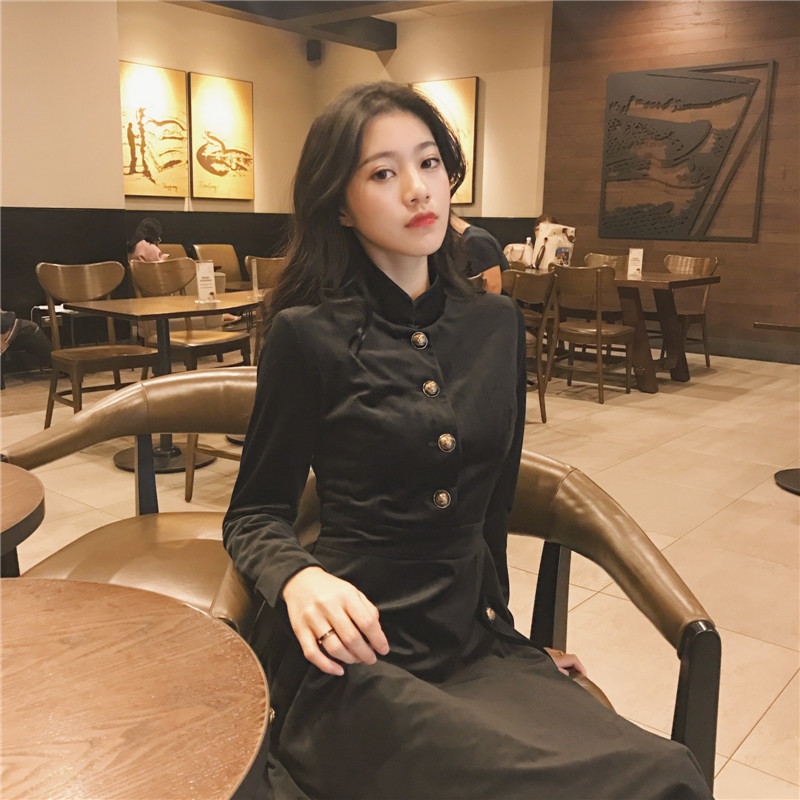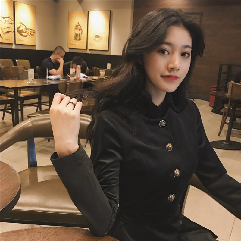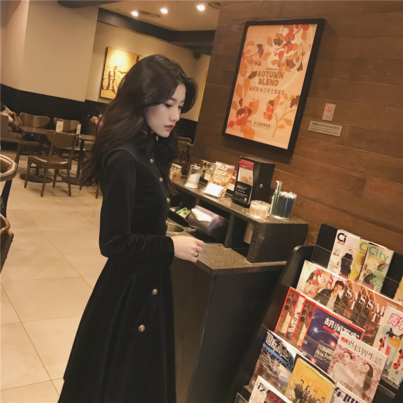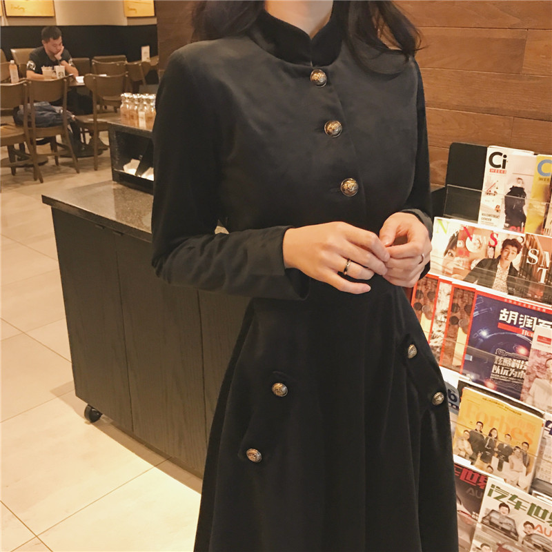 / 晚晚風新款秋季顯瘦連衣裙女氣質立領絲絨長袖黑色外套裙子加里布
