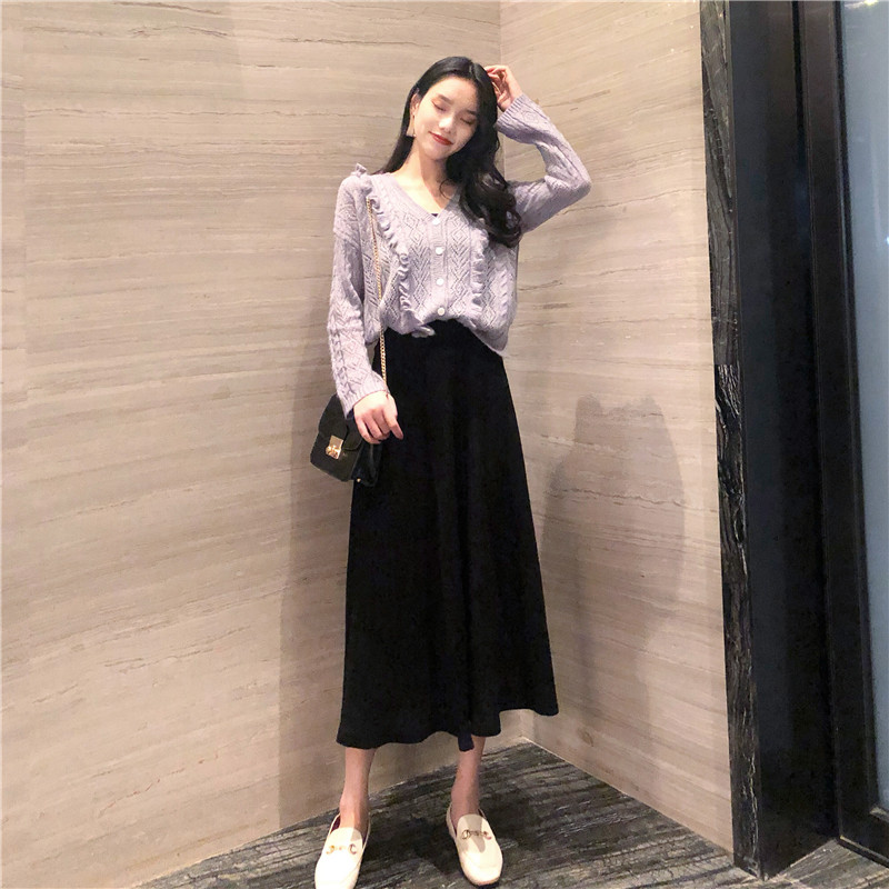 / 韓國復古風木耳邊毛衣女秋冬2018新款開衫外套+高腰針織半身裙女