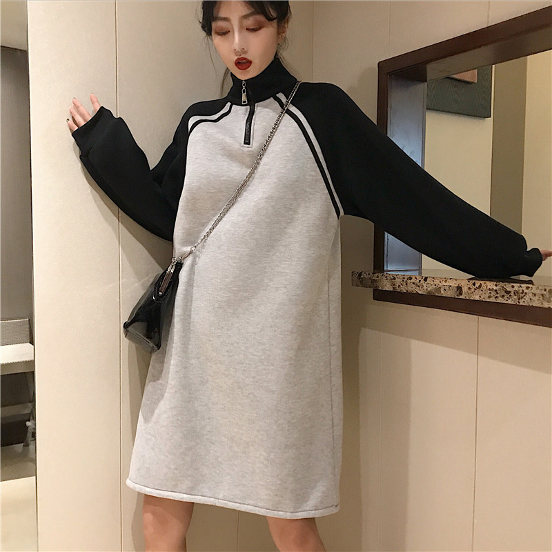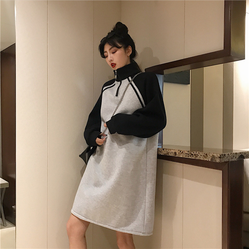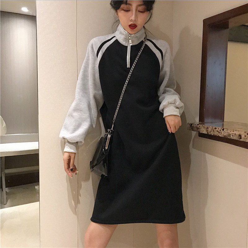 早秋衛衣2018新款女長袖韓版chic寬松顯瘦中長款拼色連衣裙衛衣潮