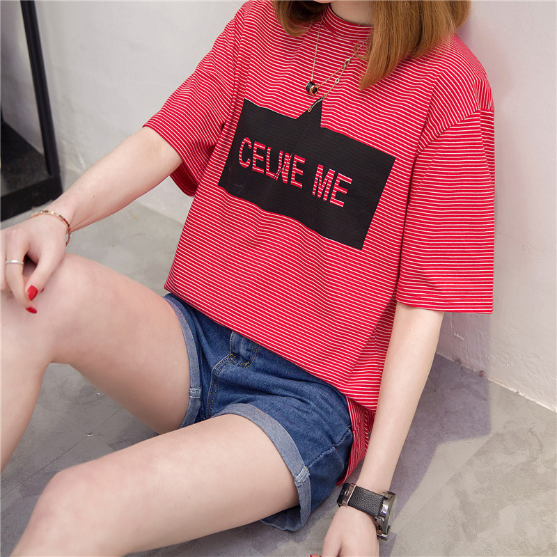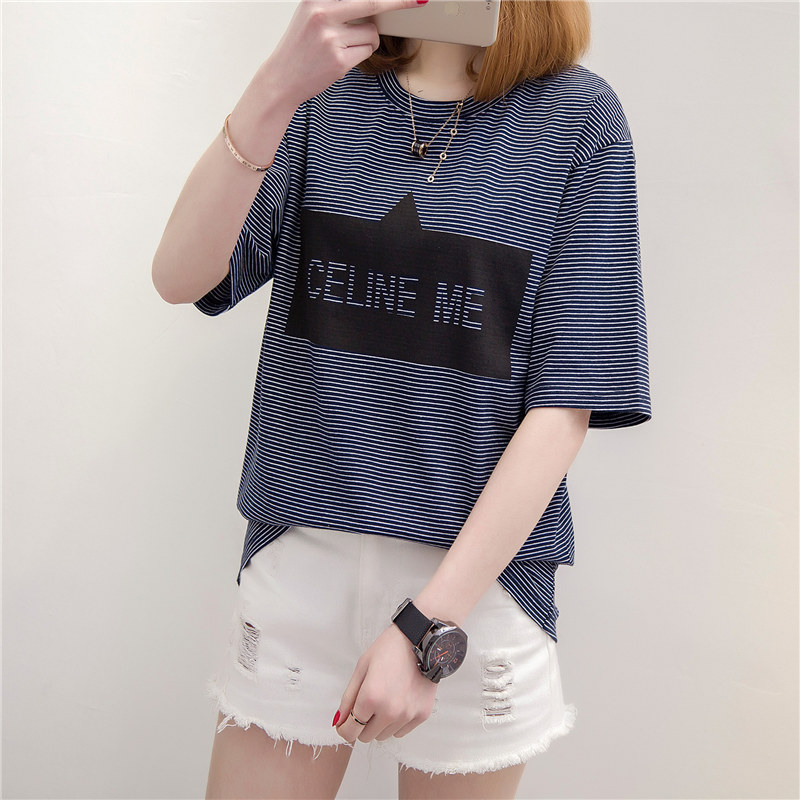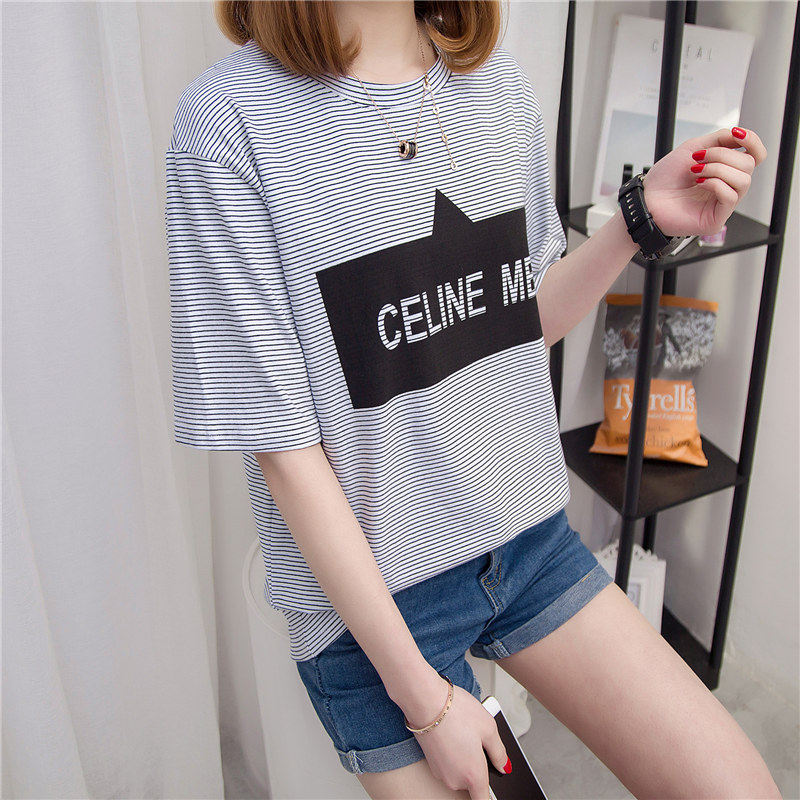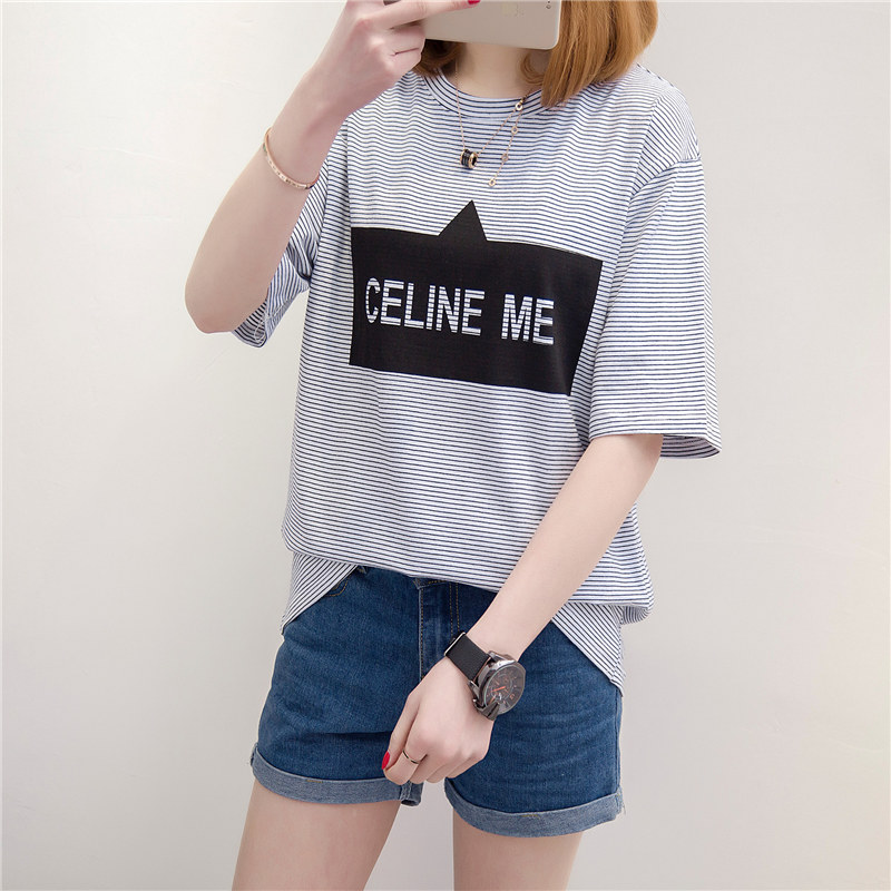 條紋t恤女短袖上衣女夏新款潮字母體恤女春裝韓版打底衫百搭