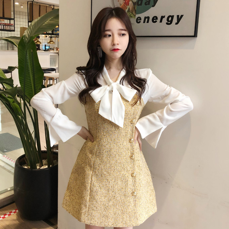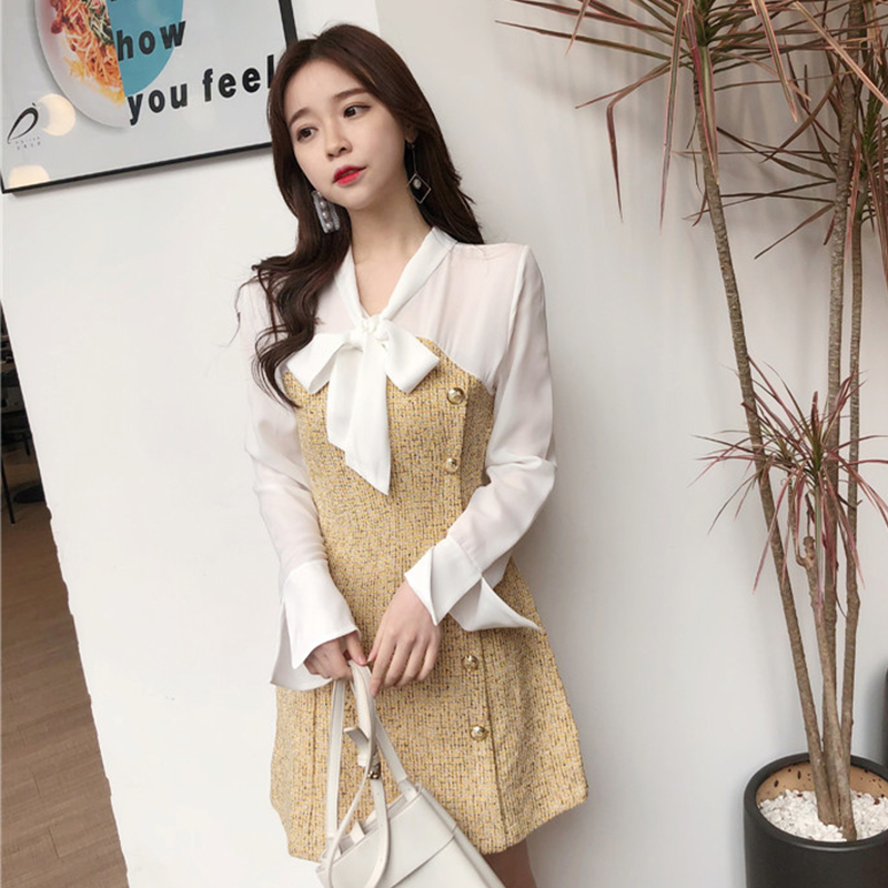 / 時尚拼接連衣裙女秋冬裝2018新款韓版系帶喇叭長袖毛呢打底a字裙