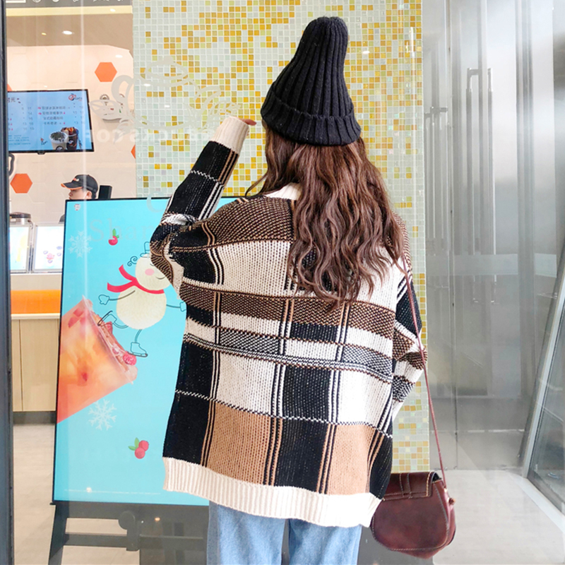 / 秋冬2018新款長袖寬松加厚格子毛衣開衫學生時尚女裝中長外套上衣