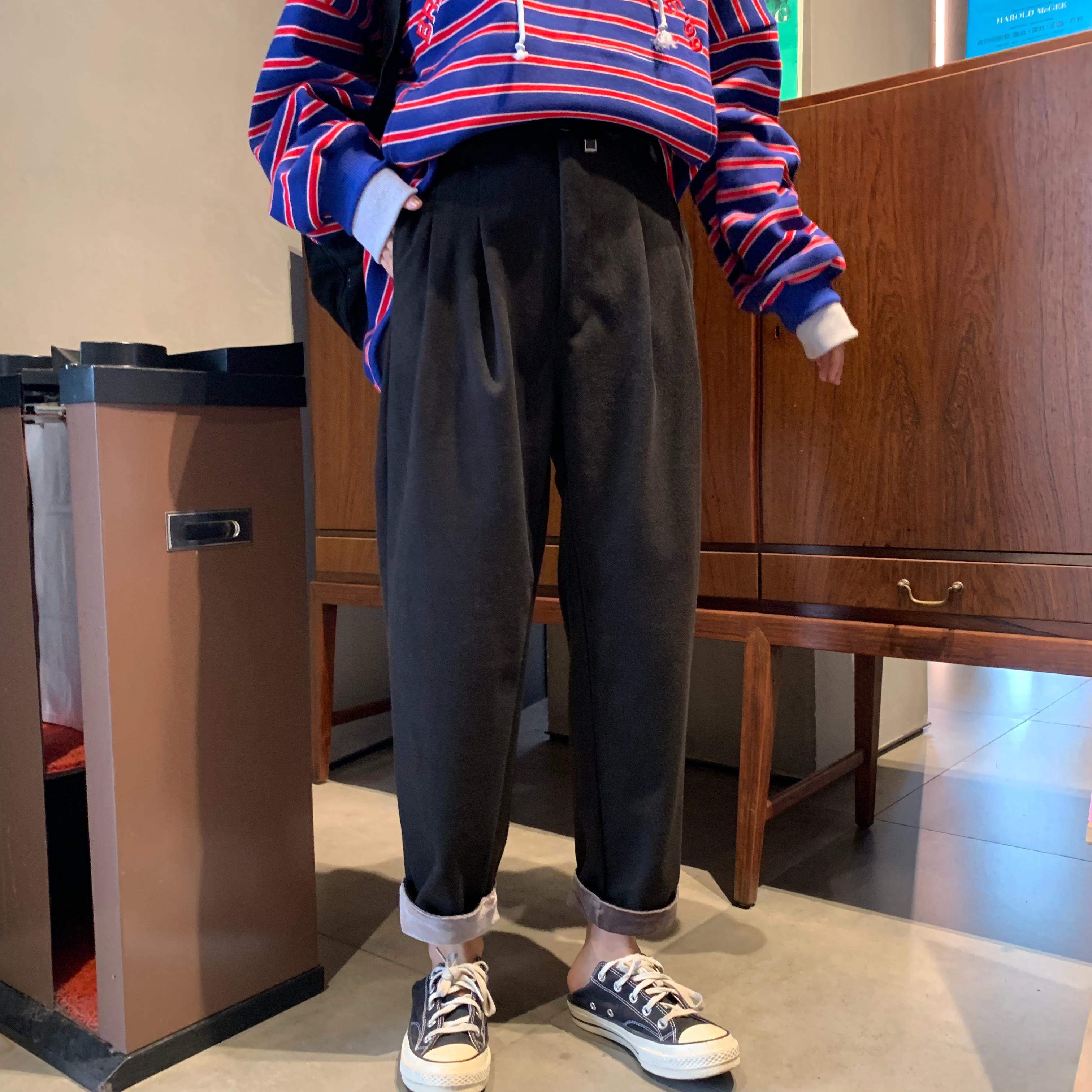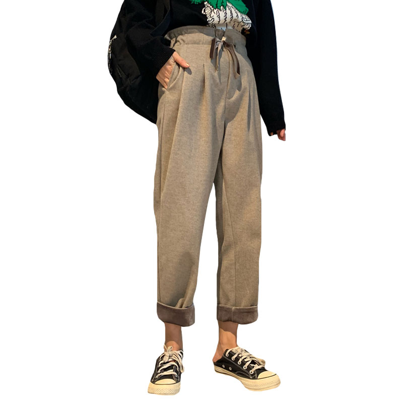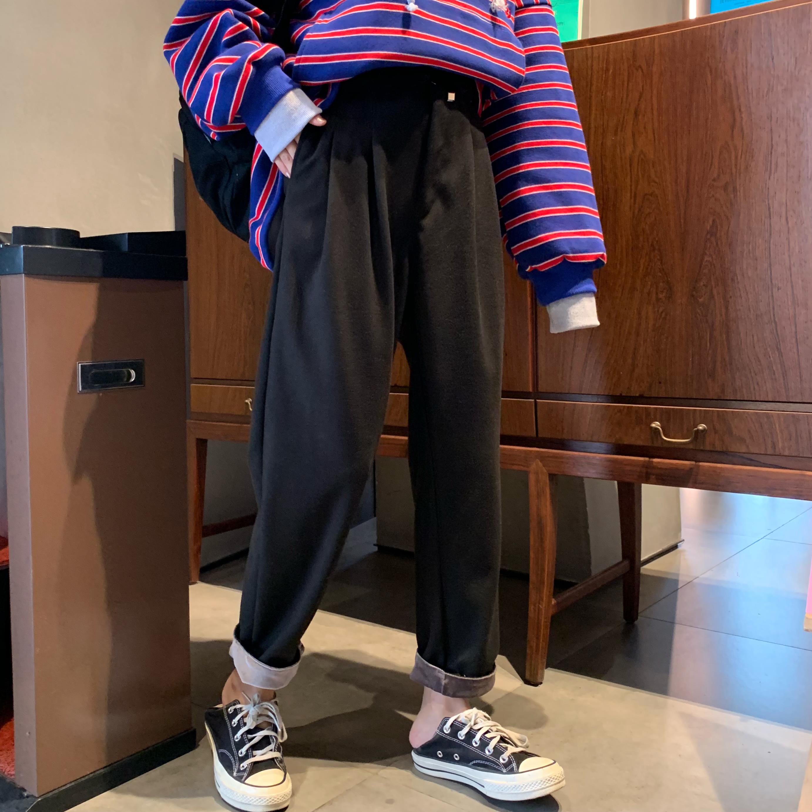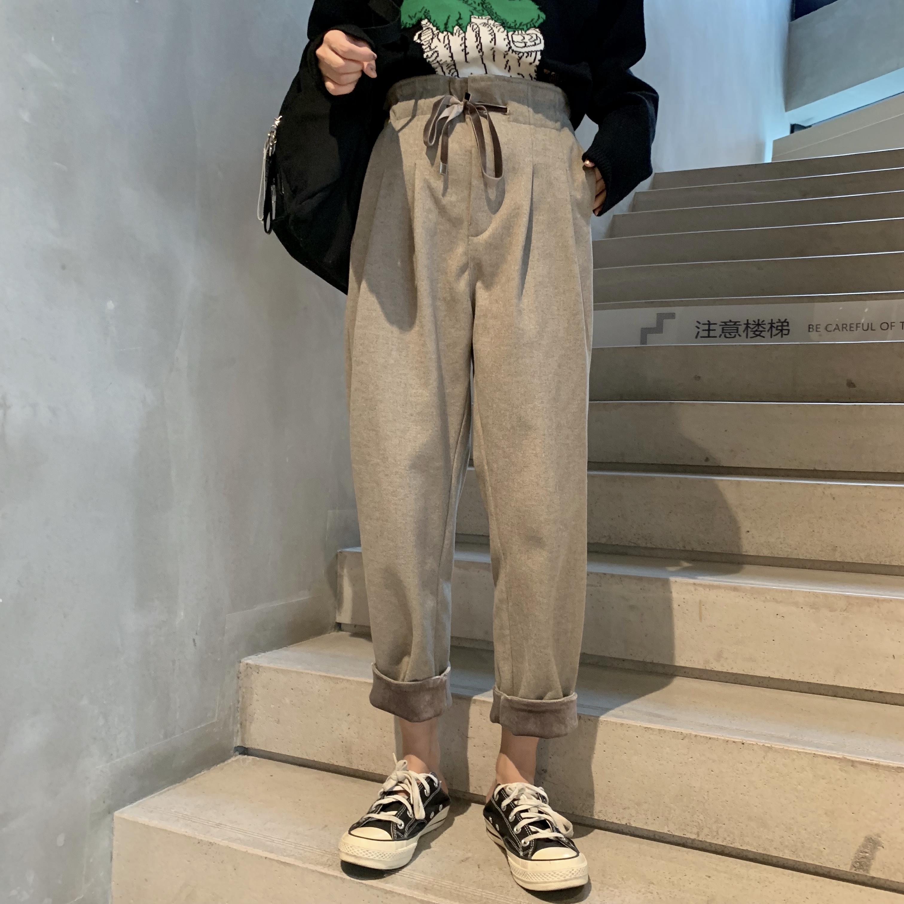 / 秋冬韓版寬松絲絨卷邊花苞系帶加厚直筒褲毛呢休閑褲闊腿褲長褲女