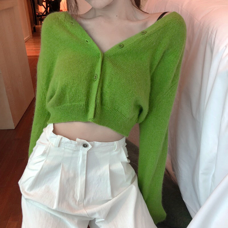 / 秋季套裝女時尚兩件套港味草綠色短款針織開衫+高腰寬松闊腿褲子