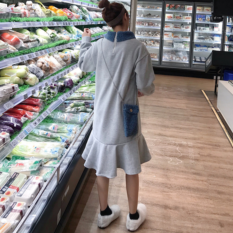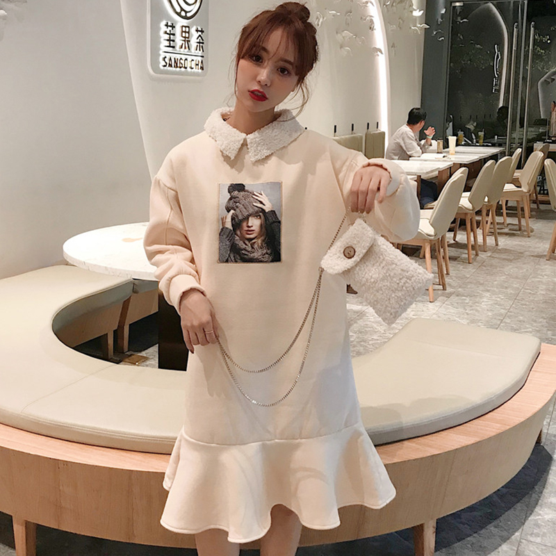 / 時尚印花加絨egg風連衣裙子女秋冬裝新款學生寬松荷葉邊A字衛衣裙