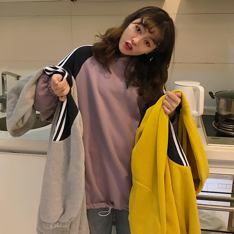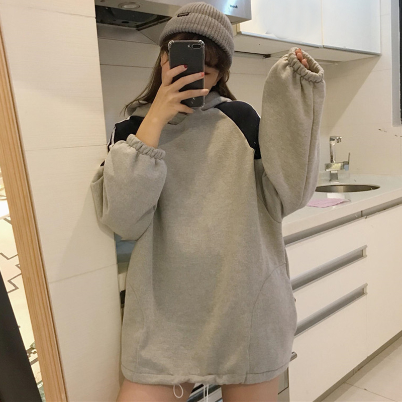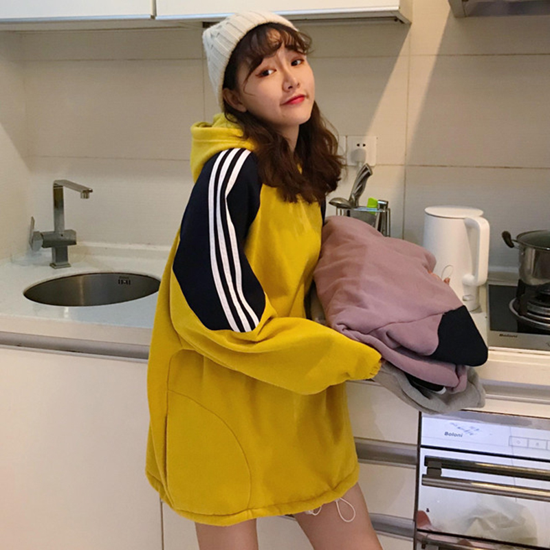 / 港味chic風中長款加絨衛衣女秋冬裝2018新款寬松拼色條紋連帽外套
