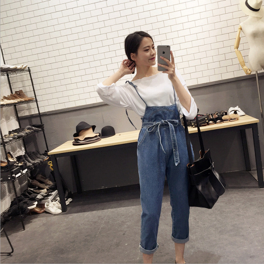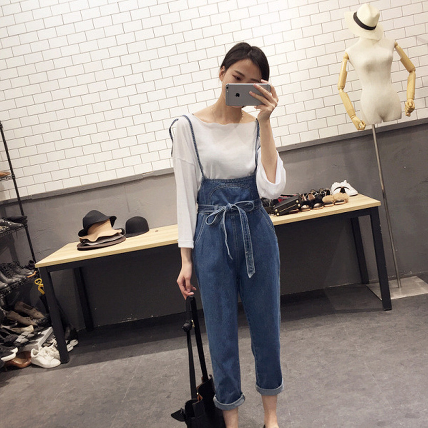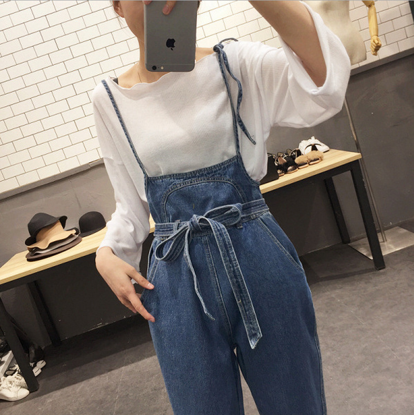 褲子女秋2018新款學院風牛仔背帶褲高腰闊腿長褲 可愛 修身顯瘦