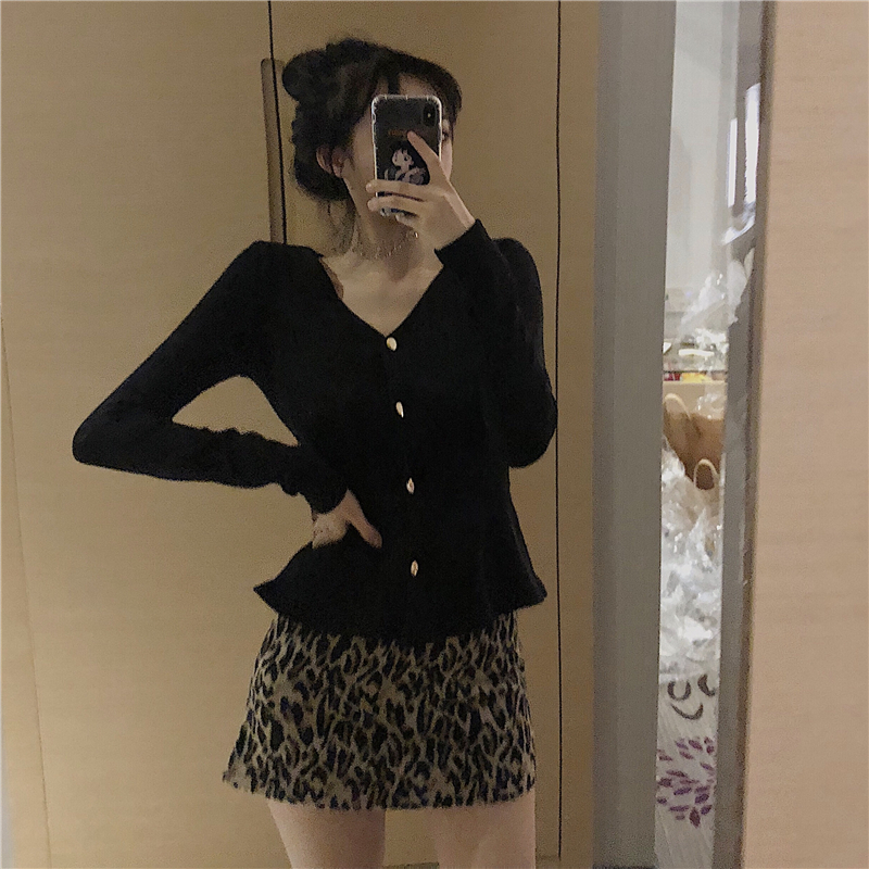 / 冬裝上衣女慵懶長袖t袖女百搭V領緊身系扣短款高腰打底針織衫開衫