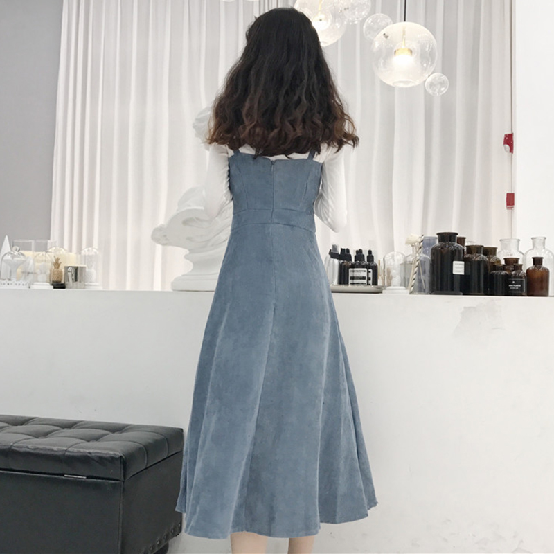 / 兩件套裝女秋冬高腰顯瘦A字吊帶連衣裙子小高領白色長袖T恤打底衫