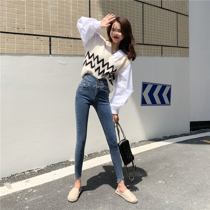 主身是毛線背心的款式,袖身的部分拼接襯衫料