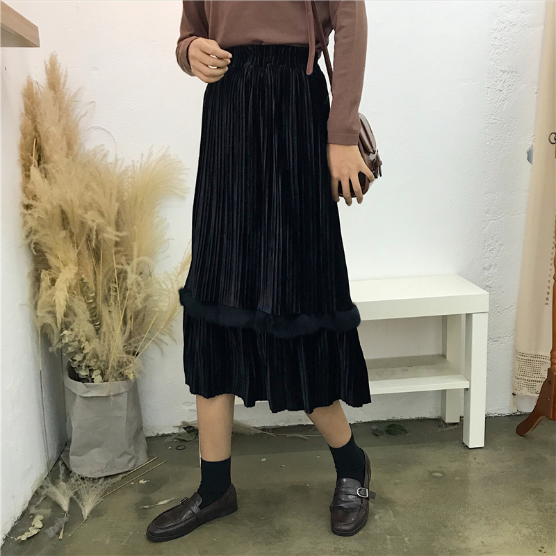 可可里小姐~2018秋冬新款絲絨百褶中長款半身裙