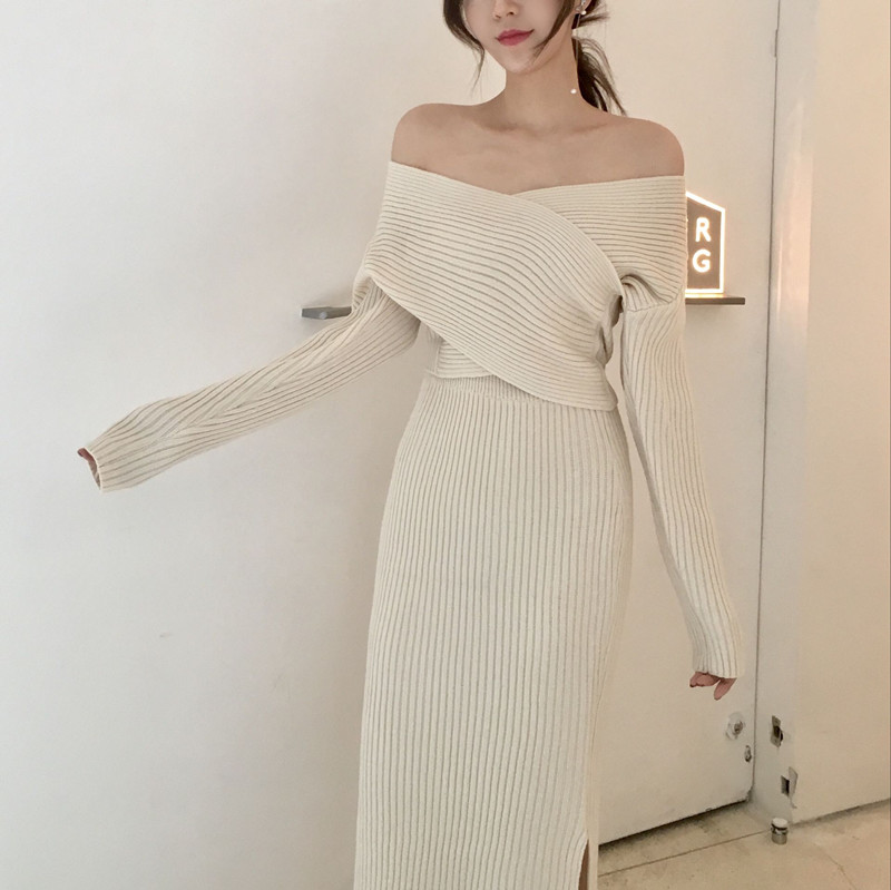 / 氣質V領毛衣時尚交叉高腰半身短裙A字裙+顯瘦針織毛衣套裝兩件套