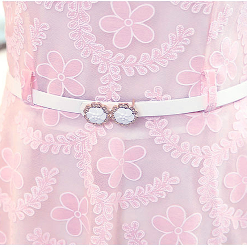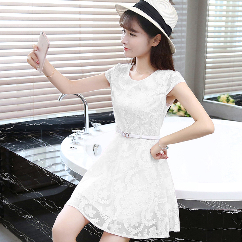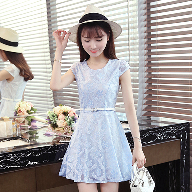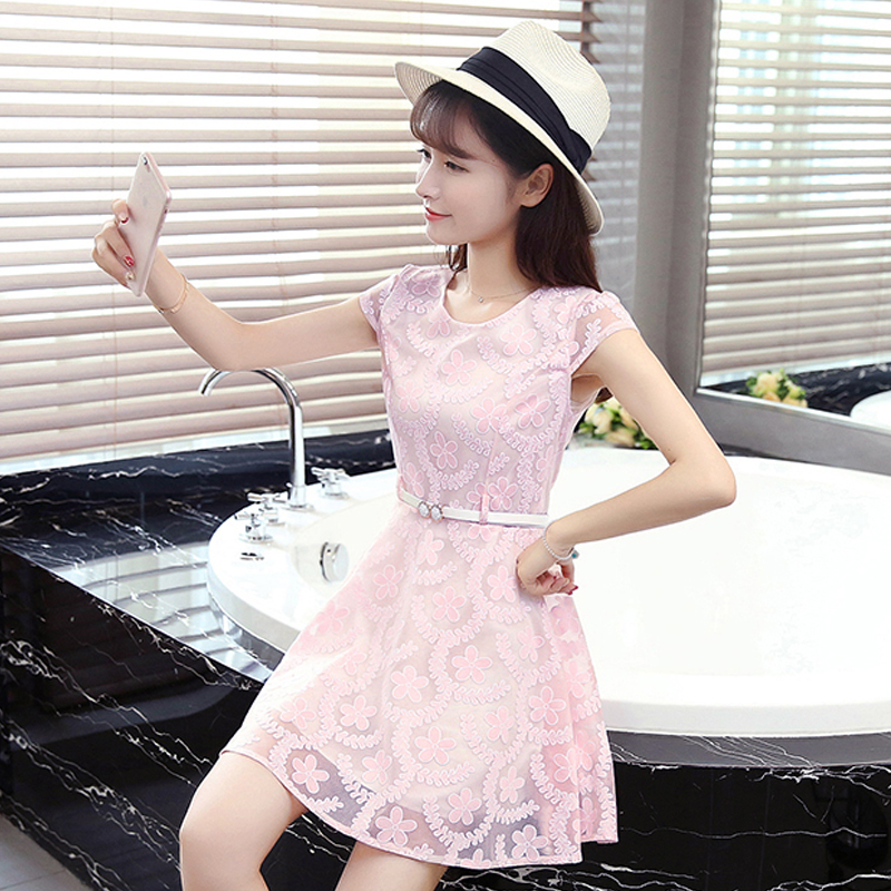 / 夏季新款韓版A字裙小清新修身蕾絲時尚連衣裙女中裙