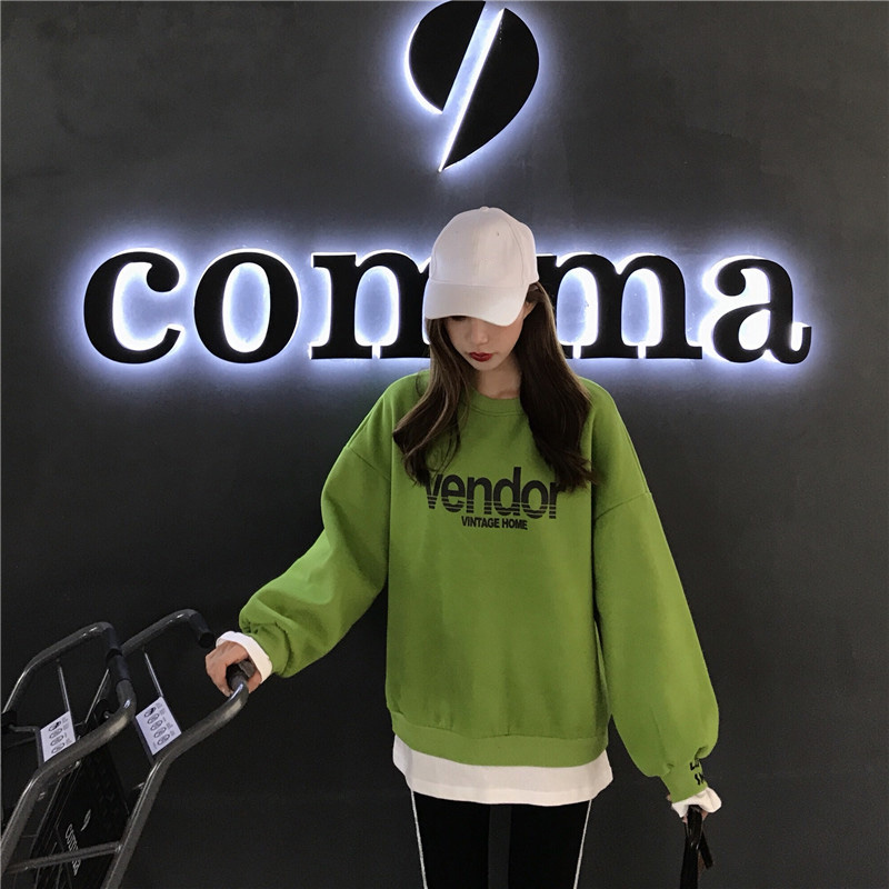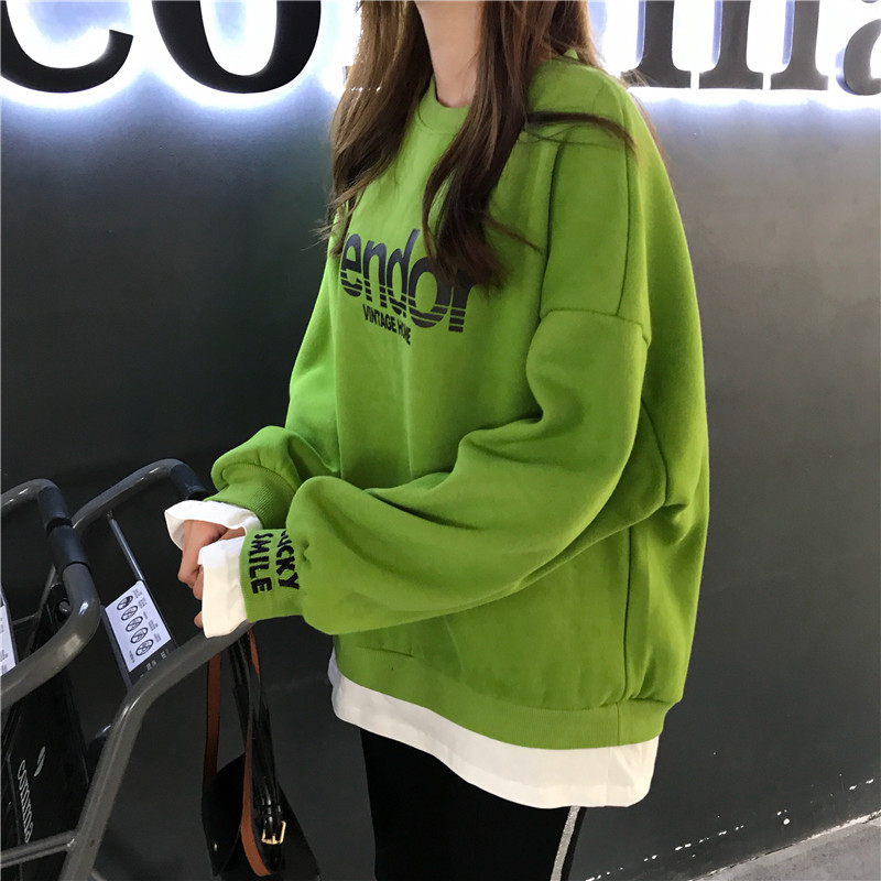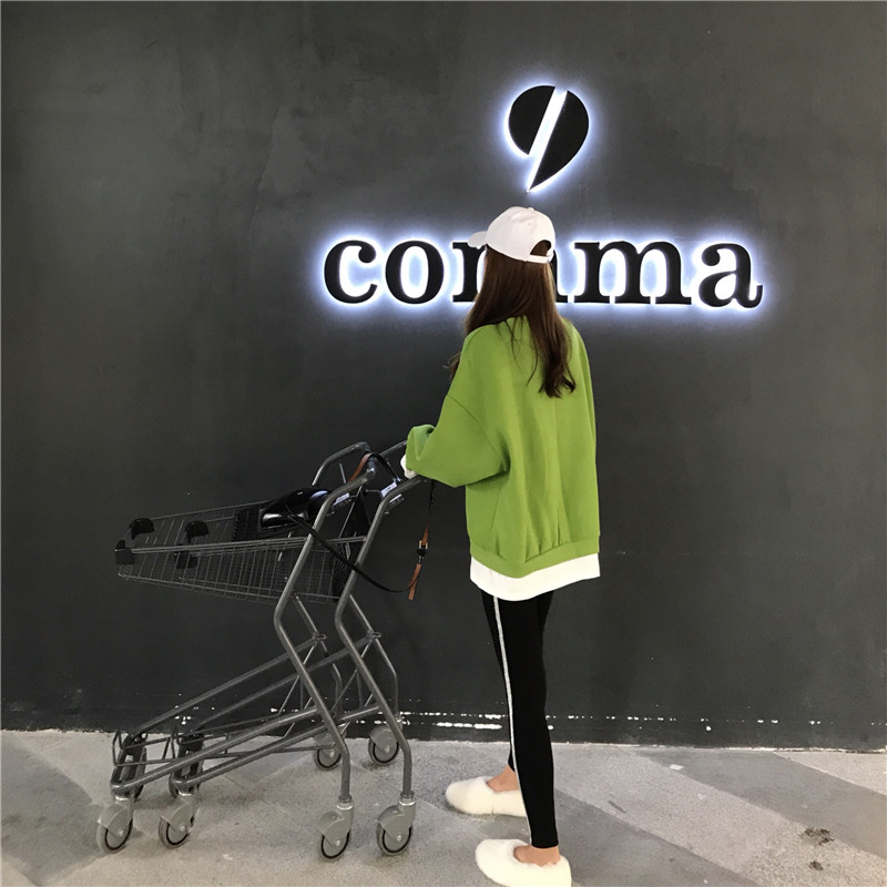 新款韓版寬松bf慵懶風假兩件加絨衛衣側邊緊身顯瘦打底褲時尚套裝