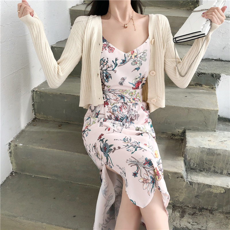 / 早秋新款兩件套裝女氣質綁帶碎花開叉吊帶連衣裙+長袖披肩短外套