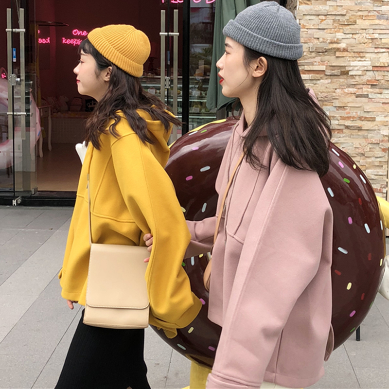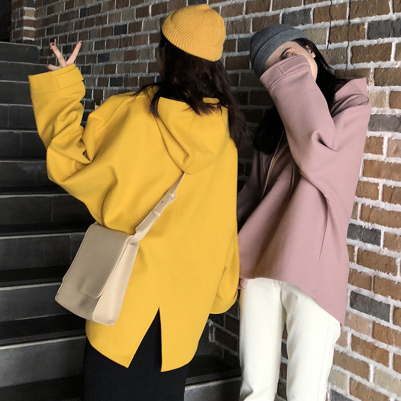 2018流行毛呢外套女秋冬裝新款純色時尚連帽衛衣學生復古休閑上衣