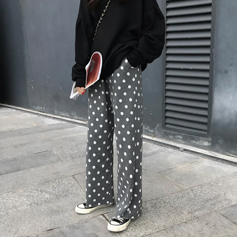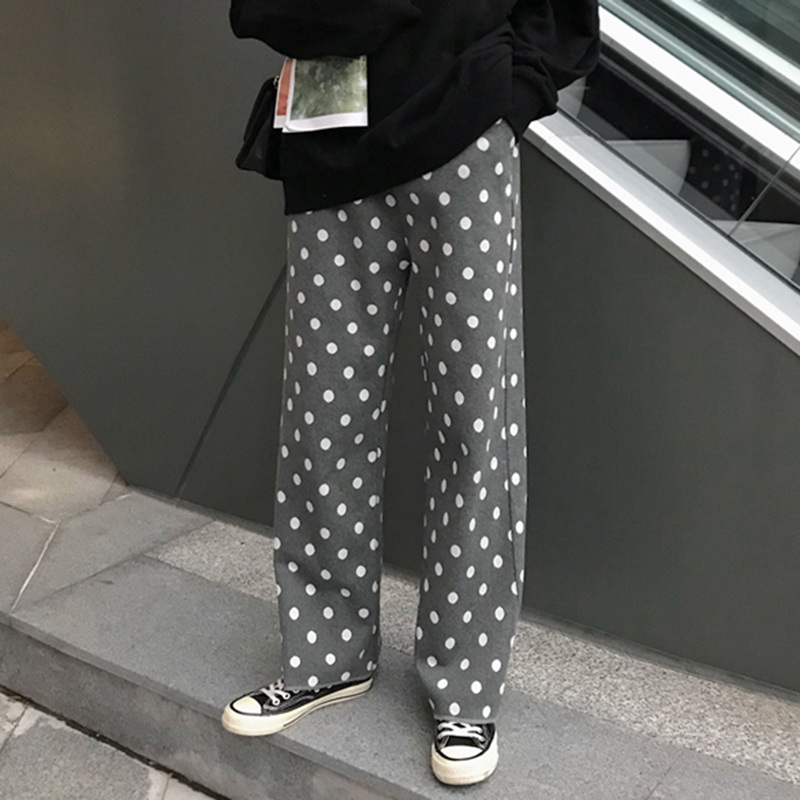 / 褲子女秋冬2018新款女裝韓版寬松針織闊腿褲學生復古波點直筒長褲