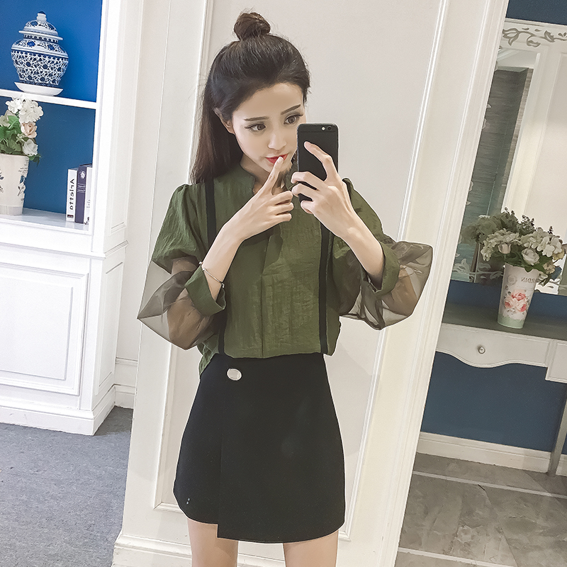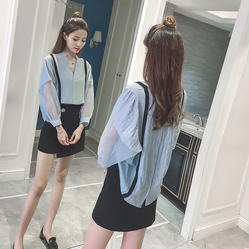 春季新款女裝V領襯衫女韓范七分袖拼接學生襯衣百搭寬松上衣