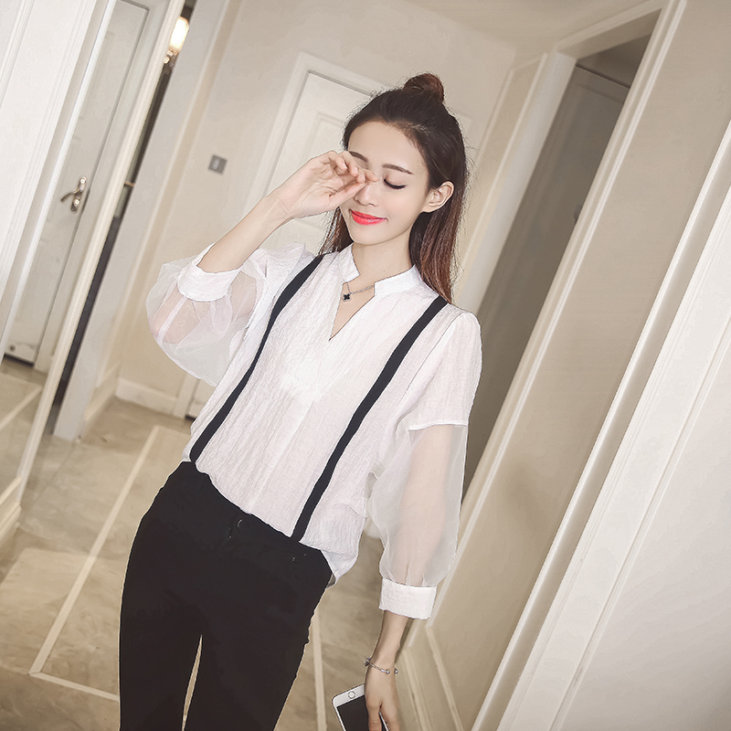 / 春季新款女裝V領襯衫女韓范七分袖拼接學生襯衣百搭寬松上衣