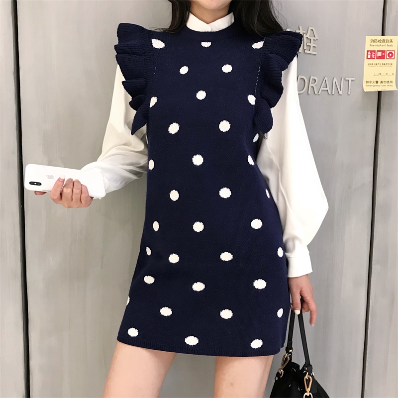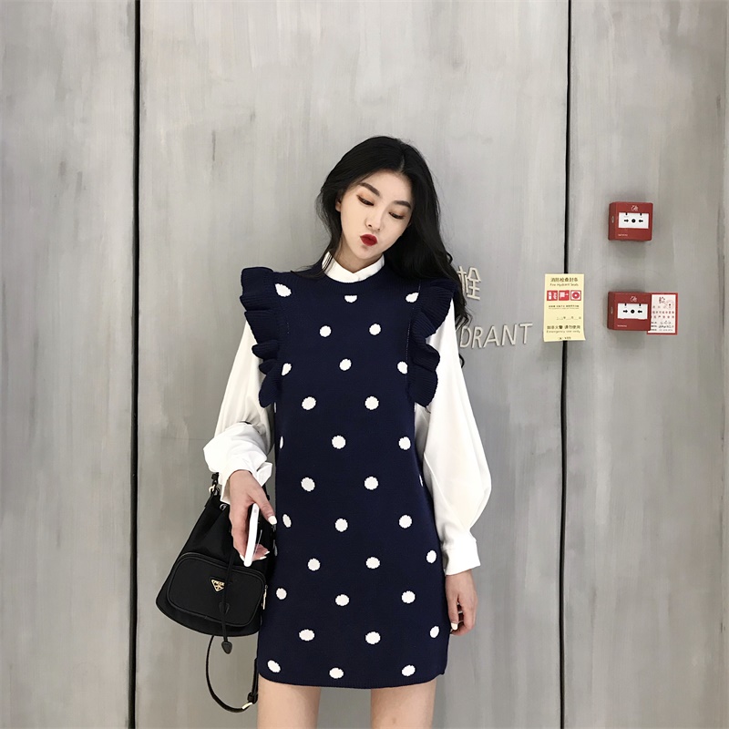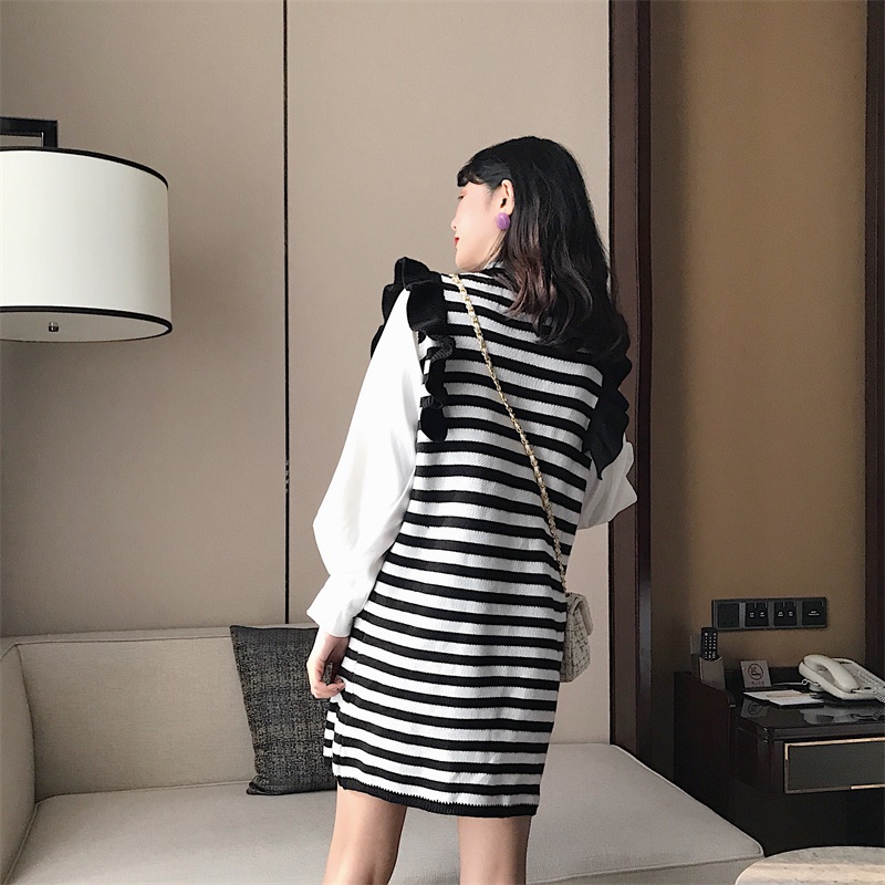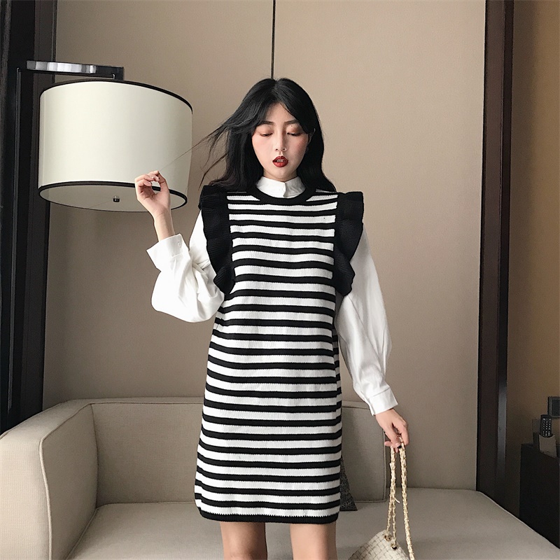 2018新款韓版針織連衣裙套裝女早秋冬毛衣背心裙襯衫加馬甲兩件套