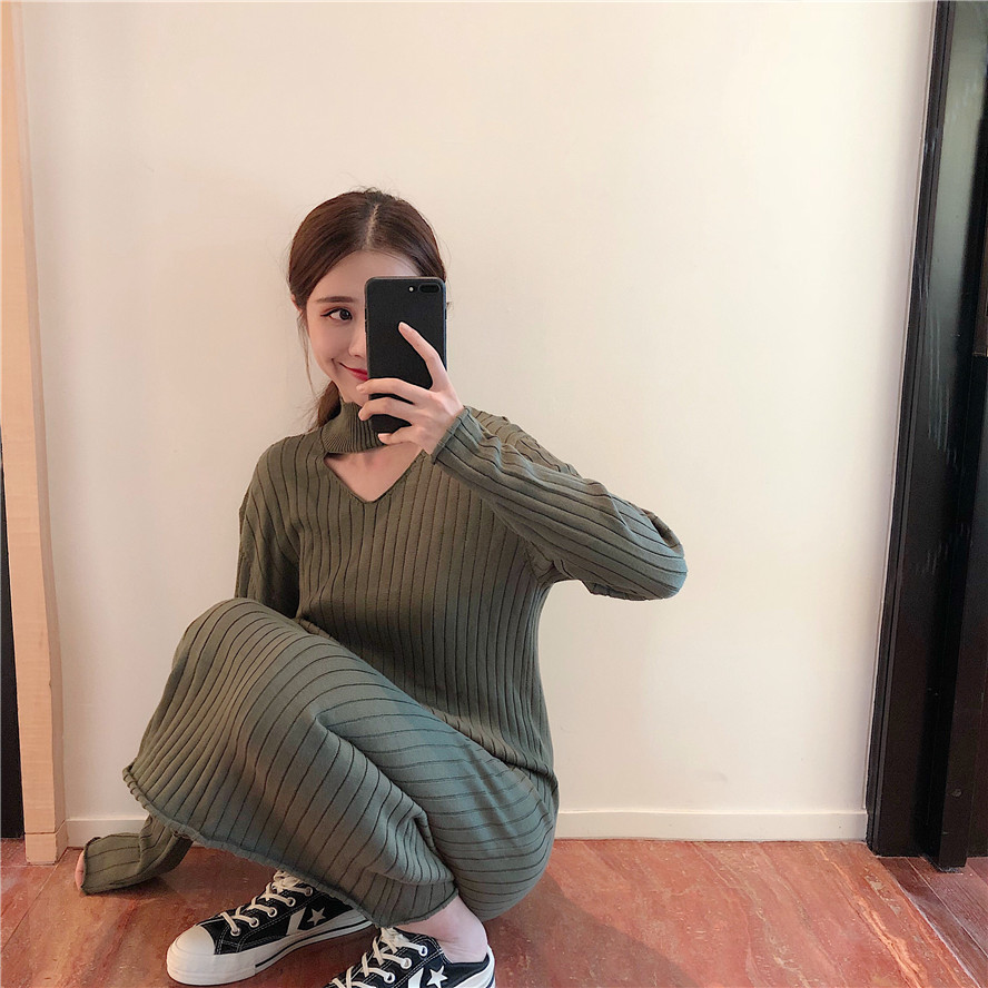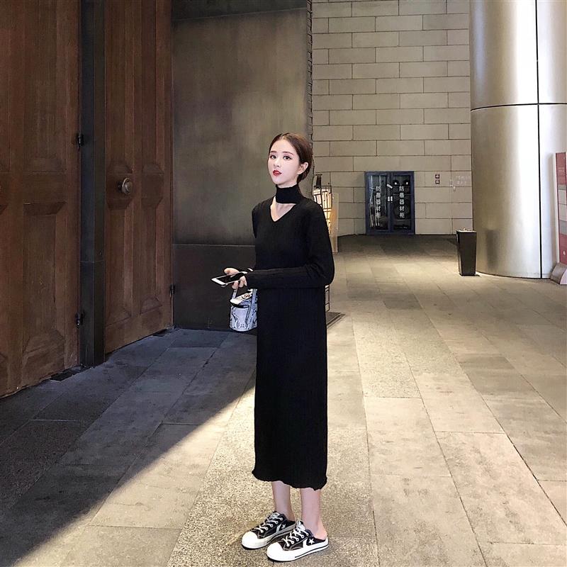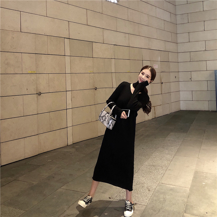 / 晚晚風韓版小心機連衣裙中長款新款chic長袖v領裙子設計感針織裙