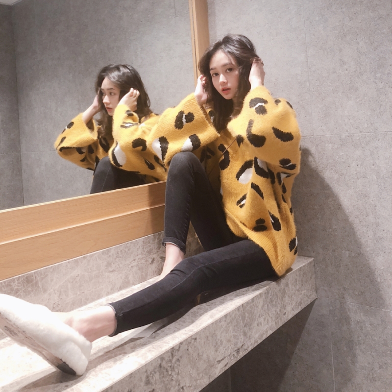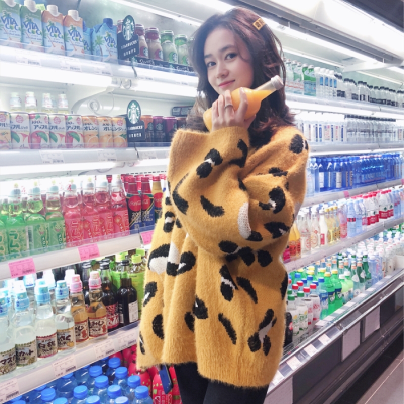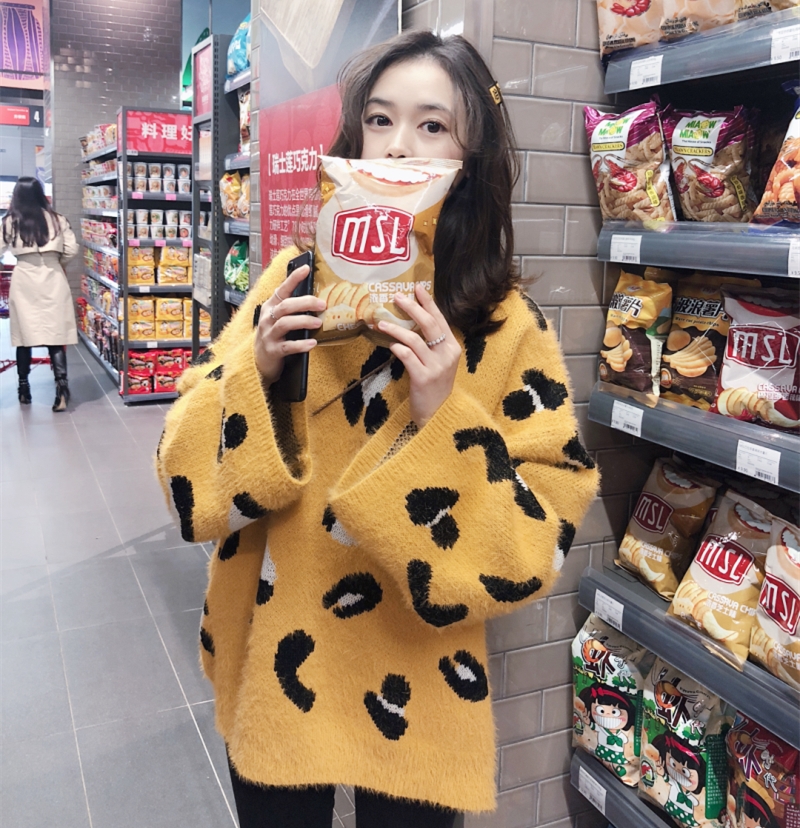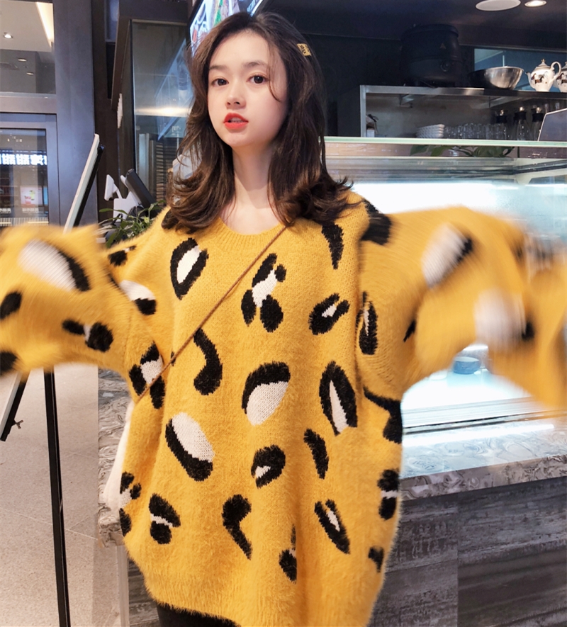 毛衣女2018新款豹紋套頭針織衫慵懶風寬松oversize中長款毛衣女潮