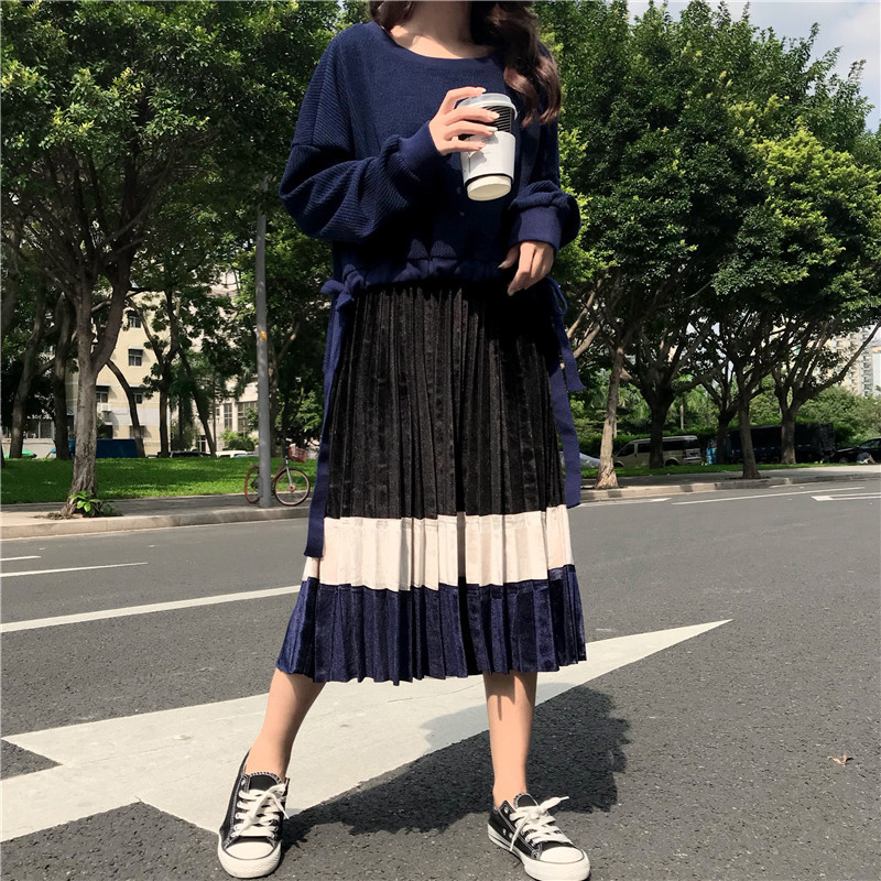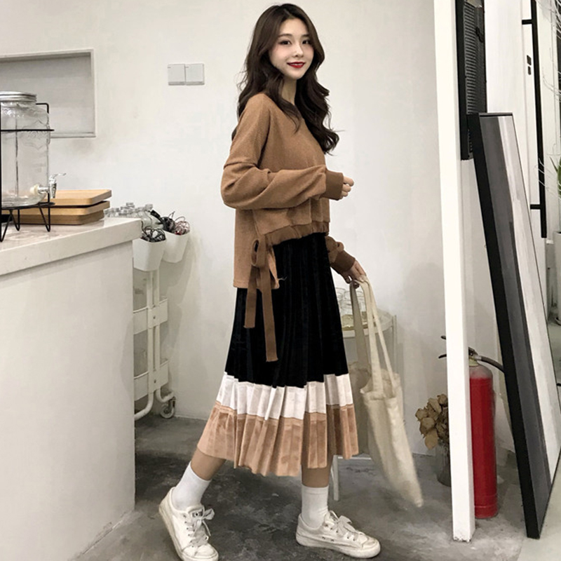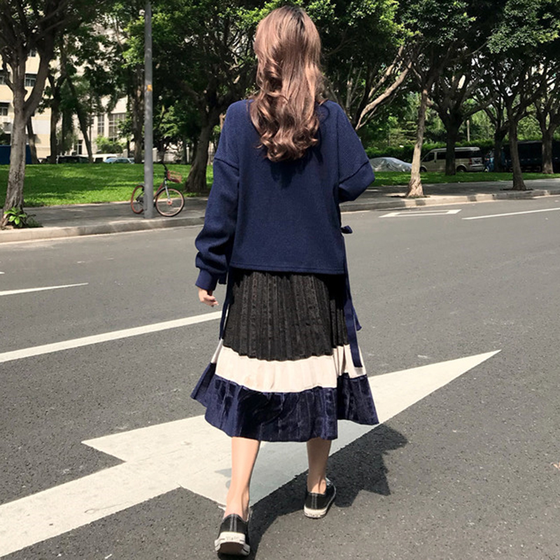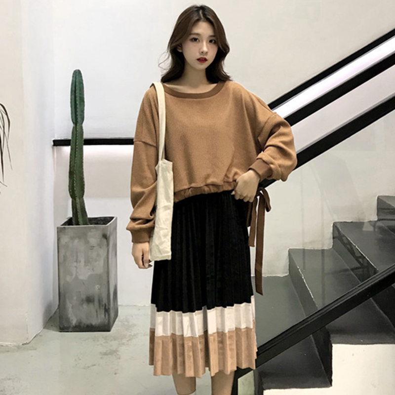 / 套裝女秋冬新款系帶寬松長袖圓領衛衣高腰顯瘦撞色A字百褶半身裙
