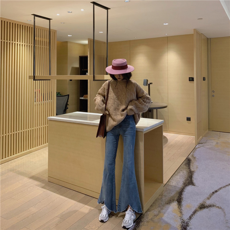 / 復古氣質喇叭褲高腰顯瘦不規則牛仔褲女春秋2018新款韓版學生長褲