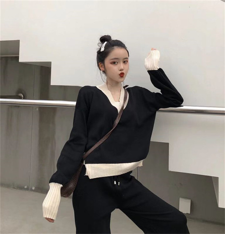 / 新款韓版拼色V領寬松針織衫上衣時尚套裝高腰闊腿休閑褲兩件套女