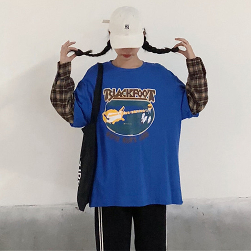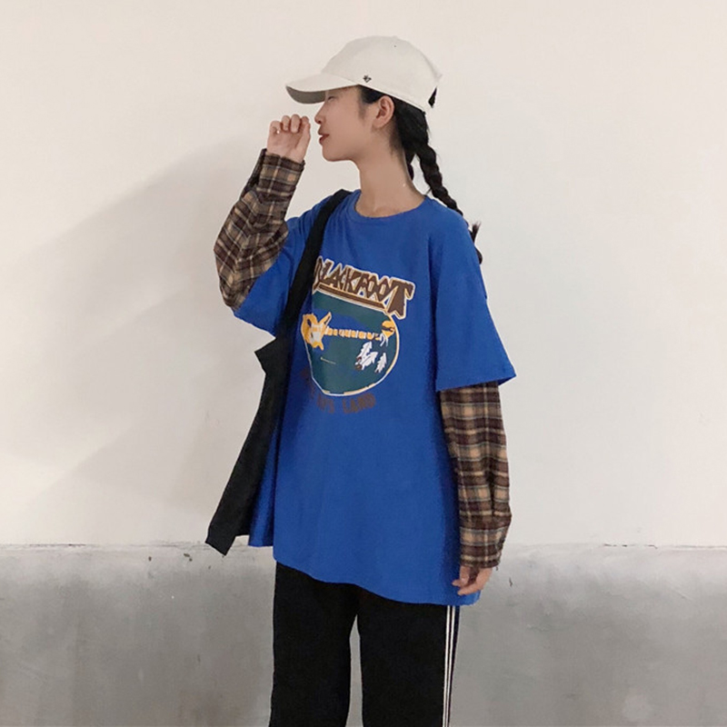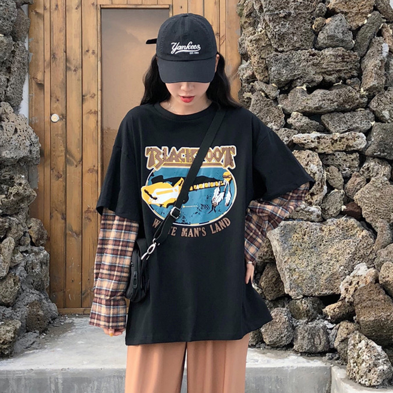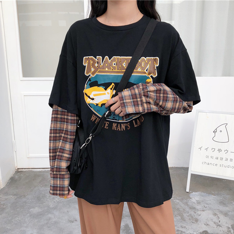 / 韓版休閑寬松印花拼接假兩件打底衫T恤秋裝女新款學生長袖上衣潮