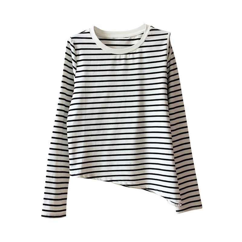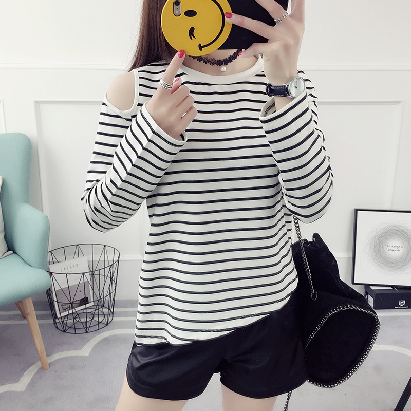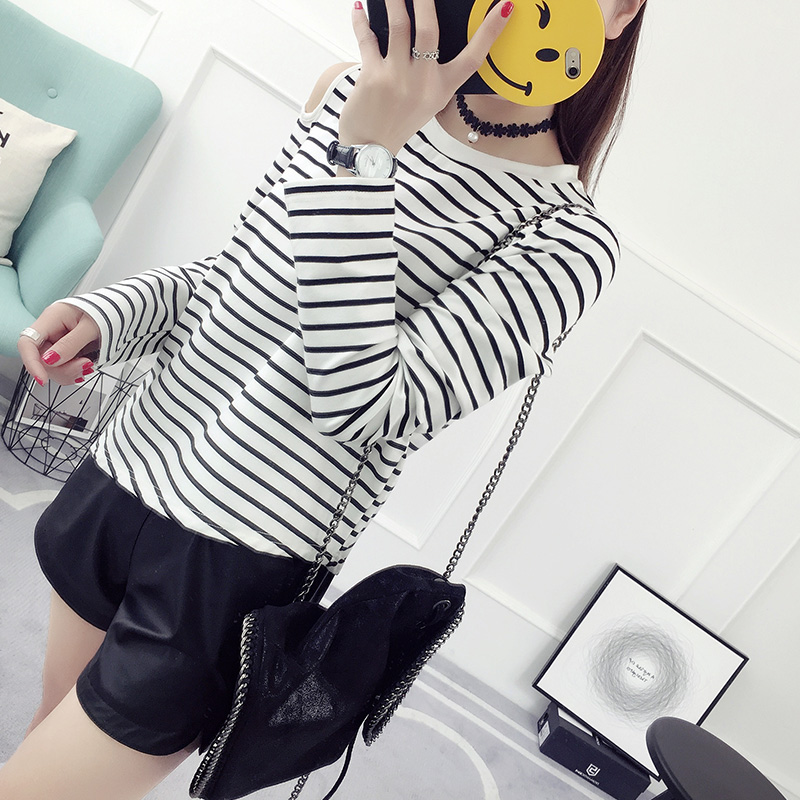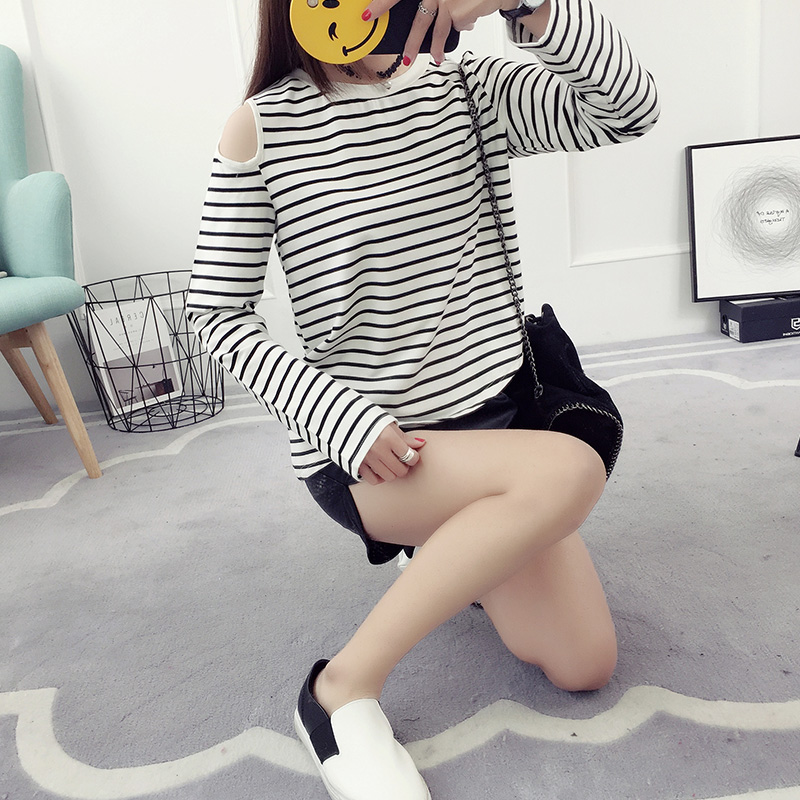 / 不規則黑白條紋t恤女長袖寬松韓版學生露肩上衣春季百搭打底衫潮