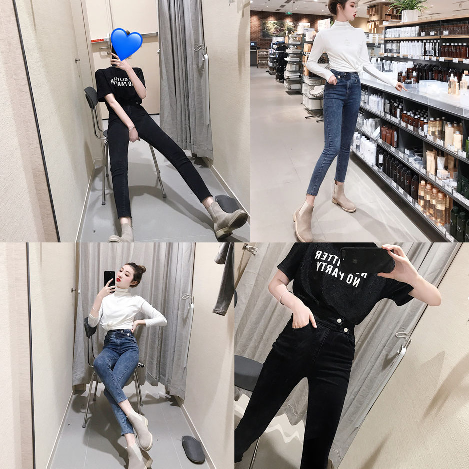 港味復古chic風秋冬褲子高腰彈力牛仔鉛筆褲緊身小腳褲百搭長褲潮