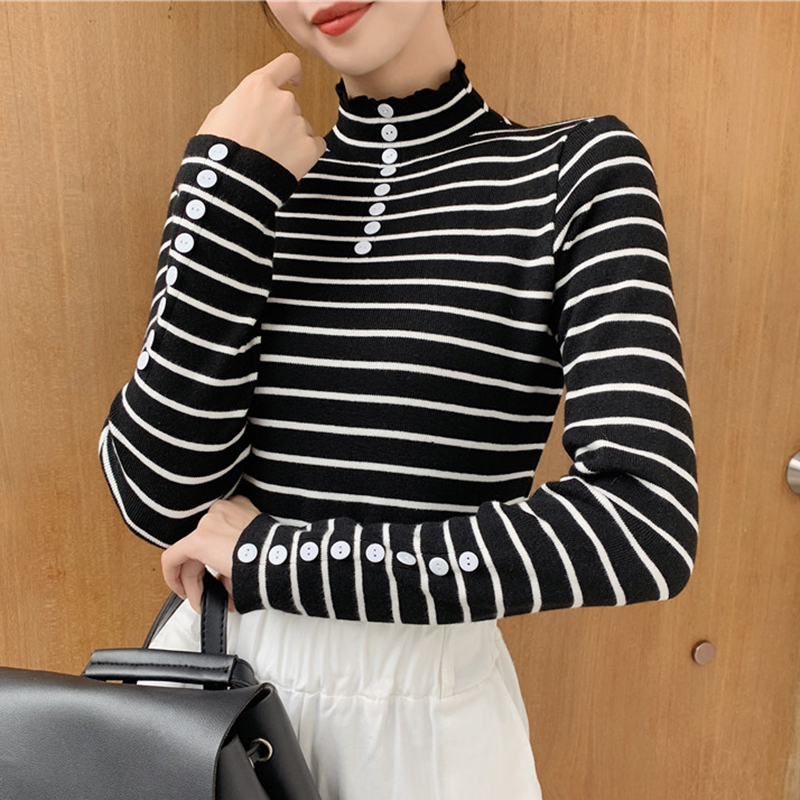 / 時尚條紋上衣修身顯瘦打底針織衫女秋冬裝新款小高領外穿套頭毛衣