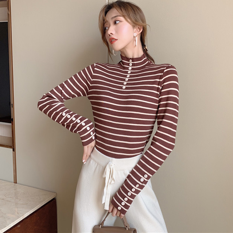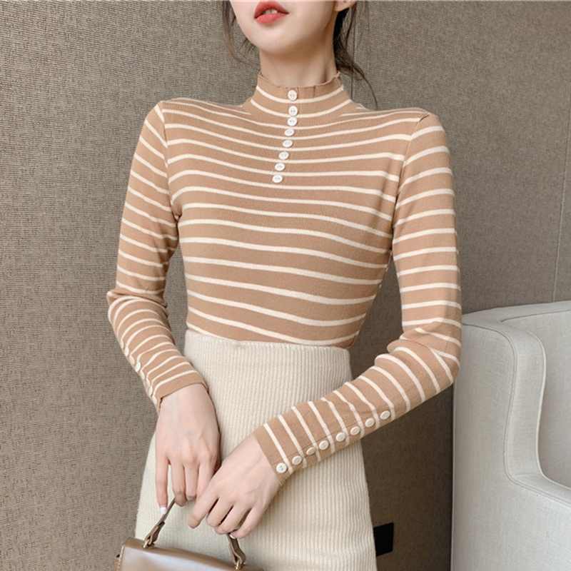 時尚條紋上衣修身顯瘦打底針織衫女秋冬裝新款小高領外穿套頭毛衣
